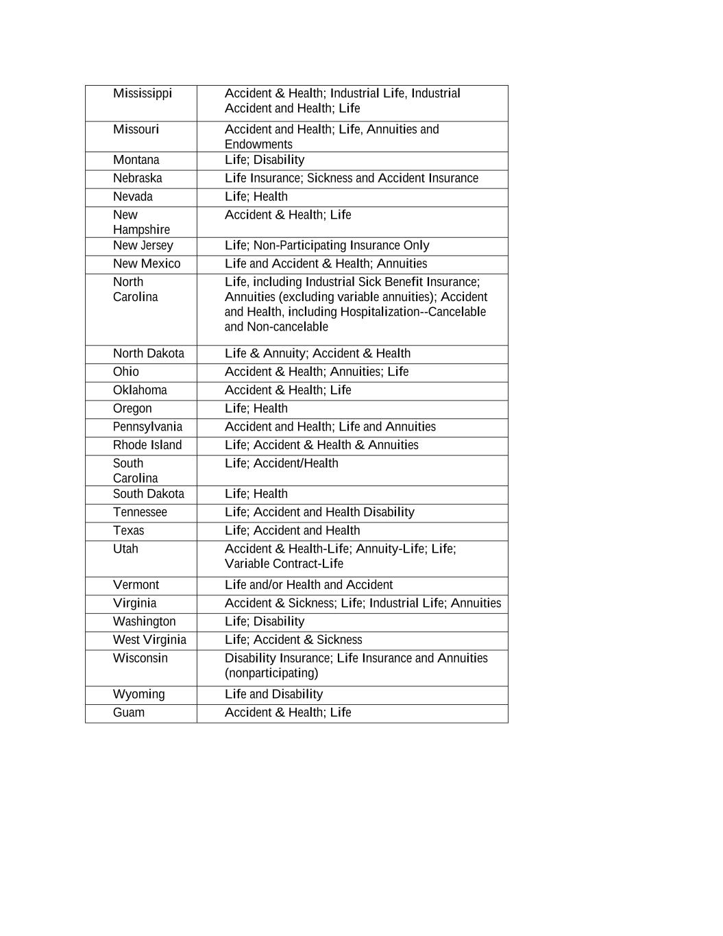 Mississippi Accident & Health; Industrial Life, Industrial Accident and Health; Life Missouri Accident and Health; Life, Annuities and Endowments Montana Life; Disability Nebraska Life Insurance; Sickness and Accident Insurance Nevada Life; Health New Hampshire Accident & Health; Life New Jersey Life; Non-Participating Insurance Only New Mexico Life and Accident & Health; Annuities North Carolina Life, including Industrial Sick Benefit Insurance; Annuities (excluding variable annuities); Accident and Health, including Hospitalization--Cancelable and Non-cancelable North Dakota Life & Annuity; Accident & Health Ohio Accident & Health; Annuities; Life Oklahoma Accident & Health; Life Oregon Life; Health Pennsylvania Accident and Health; Life and Annuities Rhode Island Life; Accident & Health & Annuities South Carolina Life; Accident/Health South Dakota Life; Health Tennessee Life; Accident and Health Disability Texas Life; Accident and Health Utah Accident & Health-Life; Annuity-Life; Life; Variable Contract-Life Vermont Life and/or Health and Accident Virginia Accident & Sickness; Life; Industrial Life; Annuities Washington Life; Disability West Virginia Life; Accident & Sickness Wisconsin Disability Insurance; Life Insurance and Annuities (nonparticipating) Wyoming Life and Disability Guam Accident & Health; Life