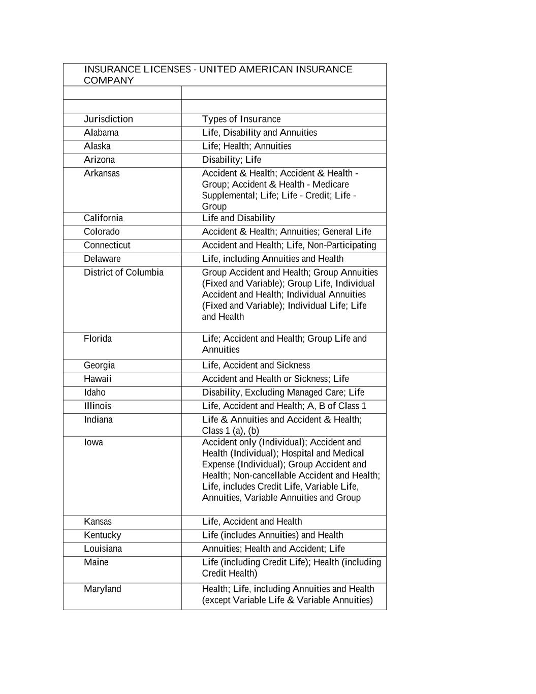 INSURANCE LICENSES - UNITED AMERICAN INSURANCE COMPANY Jurisdiction Types of Insurance Alabama Life, Disability and Annuities Alaska Life; Health; Annuities Arizona Disability; Life Arkansas Accident & Health; Accident & Health - Group; Accident & Health - Medicare Supplemental; Life; Life - Credit; Life - Group California Life and Disability Colorado Accident & Health; Annuities; General Life Connecticut Accident and Health; Life, Non-Participating Delaware Life, including Annuities and Health District of Columbia Group Accident and Health; Group Annuities (Fixed and Variable); Group Life, Individual Accident and Health; Individual Annuities (Fixed and Variable); Individual Life; Life and Health Florida Life; Accident and Health; Group Life and Annuities Georgia Life, Accident and Sickness Hawaii Accident and Health or Sickness; Life Idaho Disability, Excluding Managed Care; Life Illinois Life, Accident and Health; A, B of Class 1 Indiana Life & Annuities and Accident & Health; Class 1 (a), (b) Iowa Accident only (Individual); Accident and Health (Individual); Hospital and Medical Expense (Individual); Group Accident and Health; Non-cancellable Accident and Health; Life, includes Credit Life, Variable Life, Annuities, Variable Annuities and Group Kansas Life, Accident and Health Kentucky Life (includes Annuities) and Health Louisiana Annuities; Health and Accident; Life Maine Life (including Credit Life); Health (including Credit Health) Maryland Health; Life, including Annuities and Health (except Variable Life & Variable Annuities)