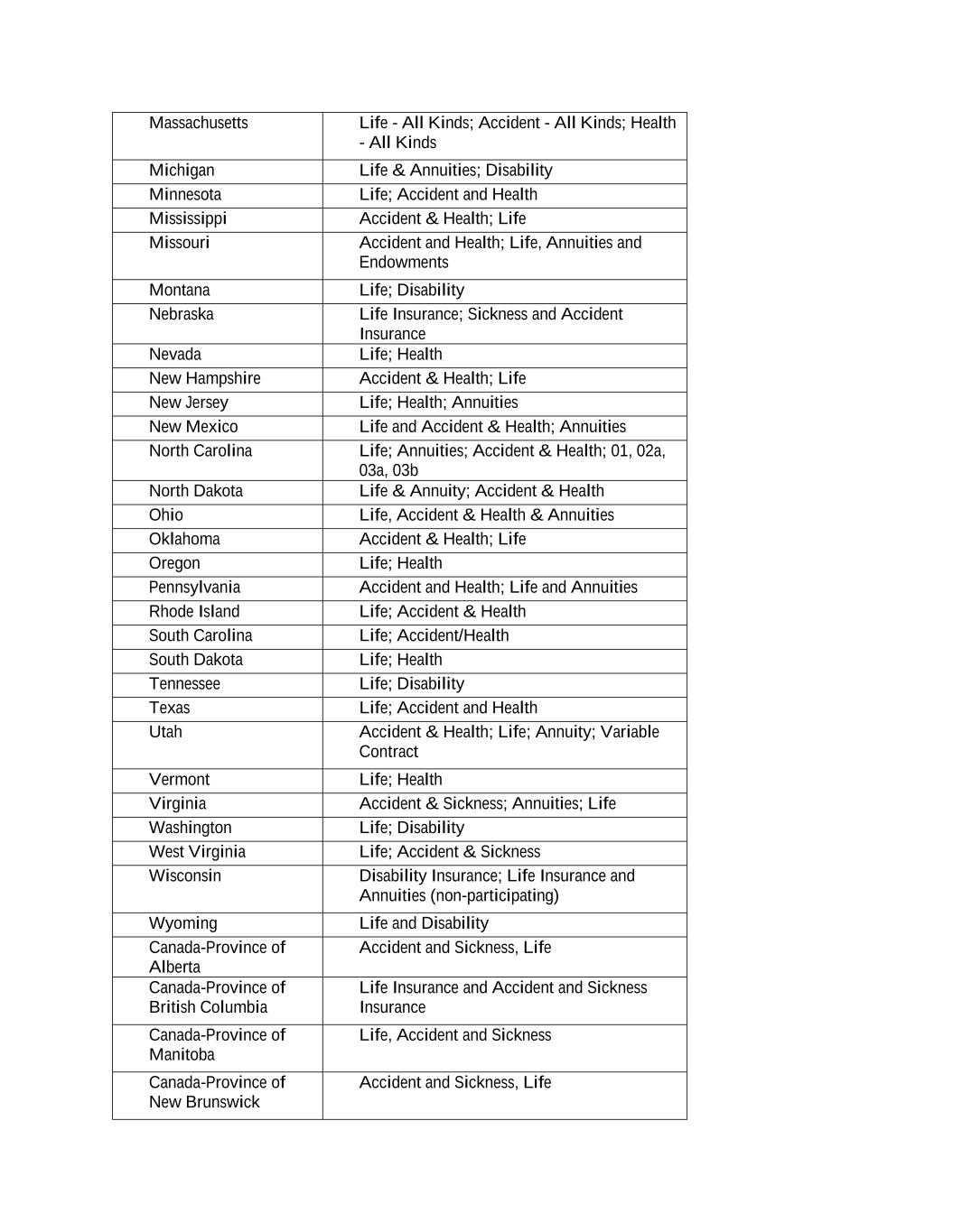Massachusetts Life - All Kinds; Accident - All Kinds; Health - All Kinds Michigan Life & Annuities; Disability Minnesota Life; Accident and Health Mississippi Accident & Health; Life Missouri Accident and Health; Life, Annuities and Endowments Montana Life; Disability Nebraska Life Insurance; Sickness and Accident Insurance Nevada Life; Health New Hampshire Accident & Health; Life New Jersey Life; Health; Annuities New Mexico Life and Accident & Health; Annuities North Carolina Life; Annuities; Accident & Health; 01, 02a, 03a, 03b North Dakota Life & Annuity; Accident & Health Ohio Life, Accident & Health & Annuities Oklahoma Accident & Health; Life Oregon Life; Health Pennsylvania Accident and Health; Life and Annuities Rhode Island Life; Accident & Health South Carolina Life; Accident/Health South Dakota Life; Health Tennessee Life; Disability Texas Life; Accident and Health Utah Accident & Health; Life; Annuity; Variable Contract Vermont Life; Health Virginia Accident & Sickness; Annuities; Life Washington Life; Disability West Virginia Life; Accident & Sickness Wisconsin Disability Insurance; Life Insurance and Annuities (non-participating) Wyoming Life and Disability Canada-Province of Alberta Accident and Sickness, Life Canada-Province of British Columbia Life Insurance and Accident and Sickness Insurance Canada-Province of Manitoba Life, Accident and Sickness Canada-Province of New Brunswick Accident and Sickness, Life