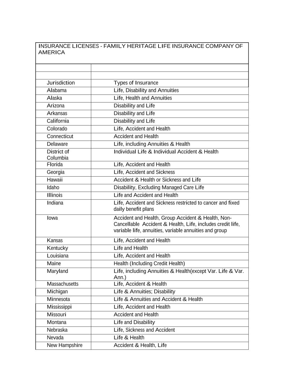 INSURANCE LICENSES - FAMILY HERITAGE LIFE INSURANCE COMPANY OF AMERICA Jurisdiction Types of Insurance Alabama Life, Disability and Annuities Alaska Life, Health and Annuities Arizona Disability and Life Arkansas Disability and Life California Disability and Life Colorado Life, Accident and Health Connecticut Accident and Health Delaware Life, including Annuities & Health District of Columbia Individual Life & Individual Accident & Health Florida Life, Accident and Health Georgia Life, Accident and Sickness Hawaii Accident & Health or Sickness and Life Idaho Disability, Excluding Managed Care Life Illinois Life and Accident and Health Indiana Life, Accident and Sickness restricted to cancer and fixed daily benefit plans Iowa Accident and Health, Group Accident & Health, Non- Cancellable Accident & Health, Life, includes credit life, variable life, annuities, variable annuities and group Kansas Life, Accident and Health Kentucky Life and Health Louisiana Life, Accident and Health Maine Health (Including Credit Health) Maryland Life, including Annuities & Health(except Var. Life & Var. Ann.) Massachusetts Life, Accident & Health Michigan Life & Annuities; Disability Minnesota Life & Annuities and Accident & Health Mississippi Life, Accident and Health Missouri Accident and Health Montana Life and Disability Nebraska Life, Sickness and Accident Nevada Life & Health New Hampshire Accident & Health, Life