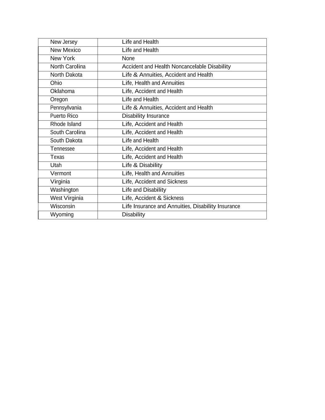 New Jersey Life and Health New Mexico Life and Health New York None North Carolina Accident and Health Noncancelable Disability North Dakota Life & Annuities, Accident and Health Ohio Life, Health and Annuities Oklahoma Life, Accident and Health Oregon Life and Health Pennsylvania Life & Annuities, Accident and Health Puerto Rico Disability Insurance Rhode Island Life, Accident and Health South Carolina Life, Accident and Health South Dakota Life and Health Tennessee Life, Accident and Health Texas Life, Accident and Health Utah Life & Disability Vermont Life, Health and Annuities Virginia Life, Accident and Sickness Washington Life and Disability West Virginia Life, Accident & Sickness Wisconsin Life Insurance and Annuities, Disability Insurance Wyoming Disability