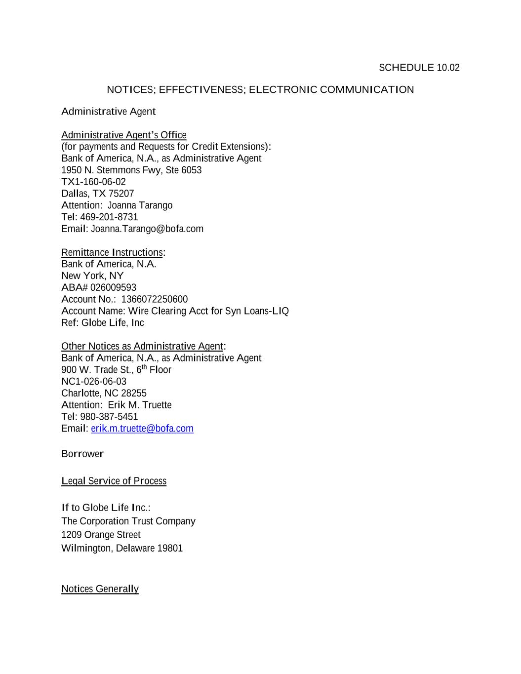 SCHEDULE 10.02 NOTICES; EFFECTIVENESS; ELECTRONIC COMMUNICATION Administrative Agent Administrative Agent’s Office (for payments and Requests for Credit Extensions): Bank of America, N.A., as Administrative Agent 1950 N. Stemmons Fwy, Ste 6053 TX1-160-06-02 Dallas, TX 75207 Attention: Joanna Tarango Tel: 469-201-8731 Email: Joanna.Tarango@bofa.com Remittance Instructions: Bank of America, N.A. New York, NY ABA# 026009593 Account No.: 1366072250600 Account Name: Wire Clearing Acct for Syn Loans-LIQ Ref: Globe Life, Inc Other Notices as Administrative Agent: Bank of America, N.A., as Administrative Agent 900 W. Trade St., 6th Floor NC1-026-06-03 Charlotte, NC 28255 Attention: Erik M. Truette Tel: 980-387-5451 Email: erik.m.truette@bofa.com Borrower Legal Service of Process If to Globe Life Inc.: The Corporation Trust Company 1209 Orange Street Wilmington, Delaware 19801 Notices Generally
