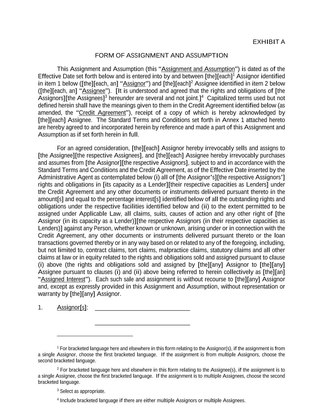 EXHIBIT A FORM OF ASSIGNMENT AND ASSUMPTION This Assignment and Assumption (this “Assignment and Assumption”) is dated as of the Effective Date set forth below and is entered into by and between [the][each]1 Assignor identified in item 1 below ([the][each, an] “Assignor”) and [the][each]2 Assignee identified in item 2 below ([the][each, an] “Assignee”). [It is understood and agreed that the rights and obligations of [the Assignors][the Assignees]3 hereunder are several and not joint.]4 Capitalized terms used but not defined herein shall have the meanings given to them in the Credit Agreement identified below (as amended, the “Credit Agreement”), receipt of a copy of which is hereby acknowledged by [the][each] Assignee. The Standard Terms and Conditions set forth in Annex 1 attached hereto are hereby agreed to and incorporated herein by reference and made a part of this Assignment and Assumption as if set forth herein in full. For an agreed consideration, [the][each] Assignor hereby irrevocably sells and assigns to [the Assignee][the respective Assignees], and [the][each] Assignee hereby irrevocably purchases and assumes from [the Assignor][the respective Assignors], subject to and in accordance with the Standard Terms and Conditions and the Credit Agreement, as of the Effective Date inserted by the Administrative Agent as contemplated below (i) all of [the Assignor’s][the respective Assignors’] rights and obligations in [its capacity as a Lender][their respective capacities as Lenders] under the Credit Agreement and any other documents or instruments delivered pursuant thereto in the amount[s] and equal to the percentage interest[s] identified below of all the outstanding rights and obligations under the respective facilities identified below and (ii) to the extent permitted to be assigned under Applicable Law, all claims, suits, causes of action and any other right of [the Assignor (in its capacity as a Lender)][the respective Assignors (in their respective capacities as Lenders)] against any Person, whether known or unknown, arising under or in connection with the Credit Agreement, any other documents or instruments delivered pursuant thereto or the loan transactions governed thereby or in any way based on or related to any of the foregoing, including, but not limited to, contract claims, tort claims, malpractice claims, statutory claims and all other claims at law or in equity related to the rights and obligations sold and assigned pursuant to clause (i) above (the rights and obligations sold and assigned by [the][any] Assignor to [the][any] Assignee pursuant to clauses (i) and (ii) above being referred to herein collectively as [the][an] “Assigned Interest”). Each such sale and assignment is without recourse to [the][any] Assignor and, except as expressly provided in this Assignment and Assumption, without representation or warranty by [the][any] Assignor. 1. Assignor[s]: ______________________________ ______________________________ 1 For bracketed language here and elsewhere in this form relating to the Assignor(s), if the assignment is from a single Assignor, choose the first bracketed language. If the assignment is from multiple Assignors, choose the second bracketed language. 2 For bracketed language here and elsewhere in this form relating to the Assignee(s), if the assignment is to a single Assignee, choose the first bracketed language. If the assignment is to multiple Assignees, choose the second bracketed language. 3 Select as appropriate. 4 Include bracketed language if there are either multiple Assignors or multiple Assignees.