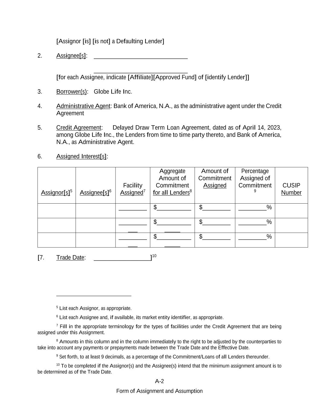 A-2 Form of Assignment and Assumption [Assignor [is] [is not] a Defaulting Lender] 2. Assignee[s]: ______________________________ ______________________________ [for each Assignee, indicate [Affiliate][Approved Fund] of [identify Lender]] 3. Borrower(s): Globe Life Inc. 4. Administrative Agent: Bank of America, N.A., as the administrative agent under the Credit Agreement 5. Credit Agreement: Delayed Draw Term Loan Agreement, dated as of April 14, 2023, among Globe Life Inc., the Lenders from time to time party thereto, and Bank of America, N.A., as Administrative Agent. 6. Assigned Interest[s]: Assignor[s]5 Assignee[s]6 Facility Assigned7 Aggregate Amount of Commitment for all Lenders8 Amount of Commitment Assigned Percentage Assigned of Commitment 9 CUSIP Number _________ $___________ $_________ _________% _________ ___ $___________ _____ $_________ _________% _________ ___ $___________ _____ $_________ _________% [7. Trade Date: __________________]10 5 List each Assignor, as appropriate. 6 List each Assignee and, if available, its market entity identifier, as appropriate. 7 Fill in the appropriate terminology for the types of facilities under the Credit Agreement that are being assigned under this Assignment. 8 Amounts in this column and in the column immediately to the right to be adjusted by the counterparties to take into account any payments or prepayments made between the Trade Date and the Effective Date. 9 Set forth, to at least 9 decimals, as a percentage of the Commitment/Loans of all Lenders thereunder. 10 To be completed if the Assignor(s) and the Assignee(s) intend that the minimum assignment amount is to be determined as of the Trade Date.