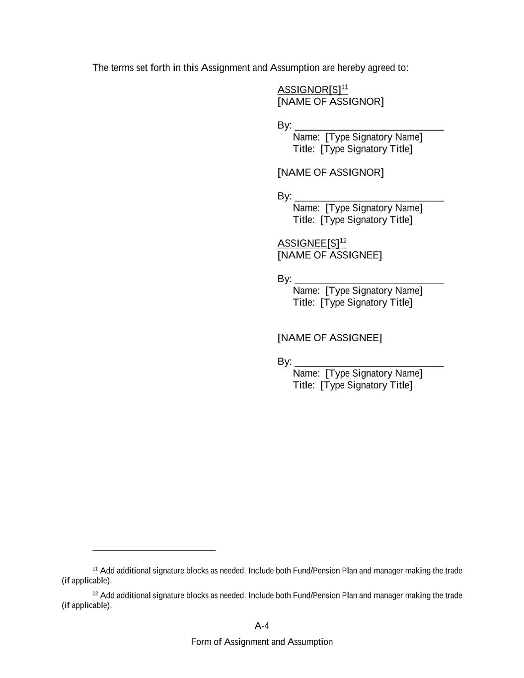 A-4 Form of Assignment and Assumption The terms set forth in this Assignment and Assumption are hereby agreed to: ASSIGNOR[S]11 [NAME OF ASSIGNOR] By: _____________________________ Name: [Type Signatory Name] Title: [Type Signatory Title] [NAME OF ASSIGNOR] By: _____________________________ Name: [Type Signatory Name] Title: [Type Signatory Title] ASSIGNEE[S]12 [NAME OF ASSIGNEE] By: _____________________________ Name: [Type Signatory Name] Title: [Type Signatory Title] [NAME OF ASSIGNEE] By: _____________________________ Name: [Type Signatory Name] Title: [Type Signatory Title] 11 Add additional signature blocks as needed. Include both Fund/Pension Plan and manager making the trade (if applicable). 12 Add additional signature blocks as needed. Include both Fund/Pension Plan and manager making the trade (if applicable).