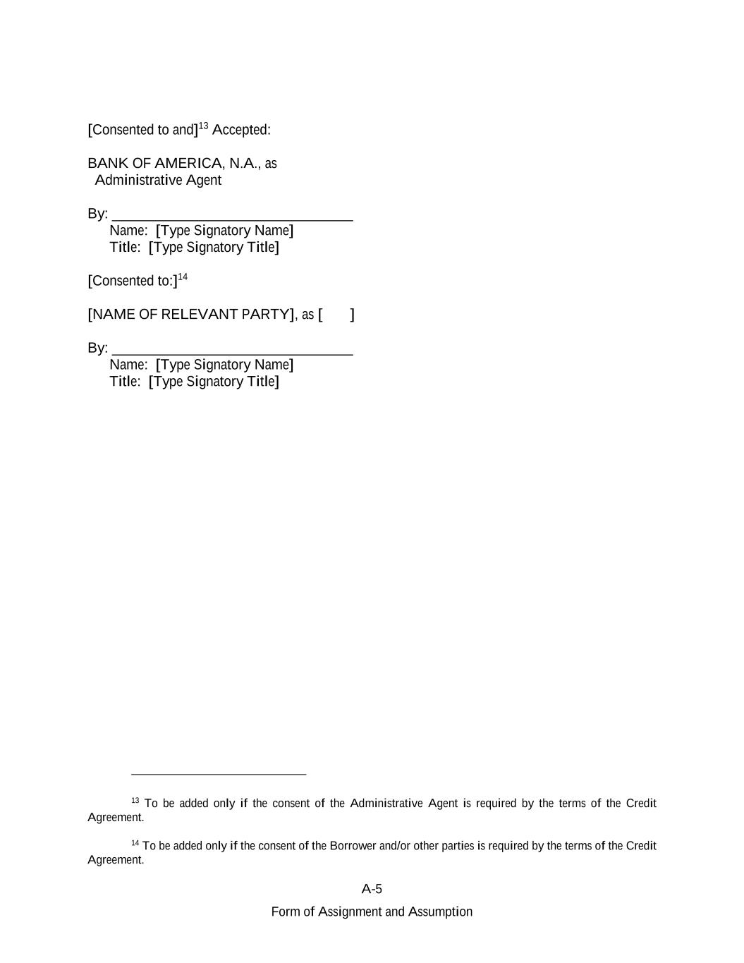 A-5 Form of Assignment and Assumption [Consented to and]13 Accepted: BANK OF AMERICA, N.A., as Administrative Agent By: _________________________________ Name: [Type Signatory Name] Title: [Type Signatory Title] [Consented to:]14 [NAME OF RELEVANT PARTY], as [ ] By: _________________________________ Name: [Type Signatory Name] Title: [Type Signatory Title] 13 To be added only if the consent of the Administrative Agent is required by the terms of the Credit Agreement. 14 To be added only if the consent of the Borrower and/or other parties is required by the terms of the Credit Agreement.