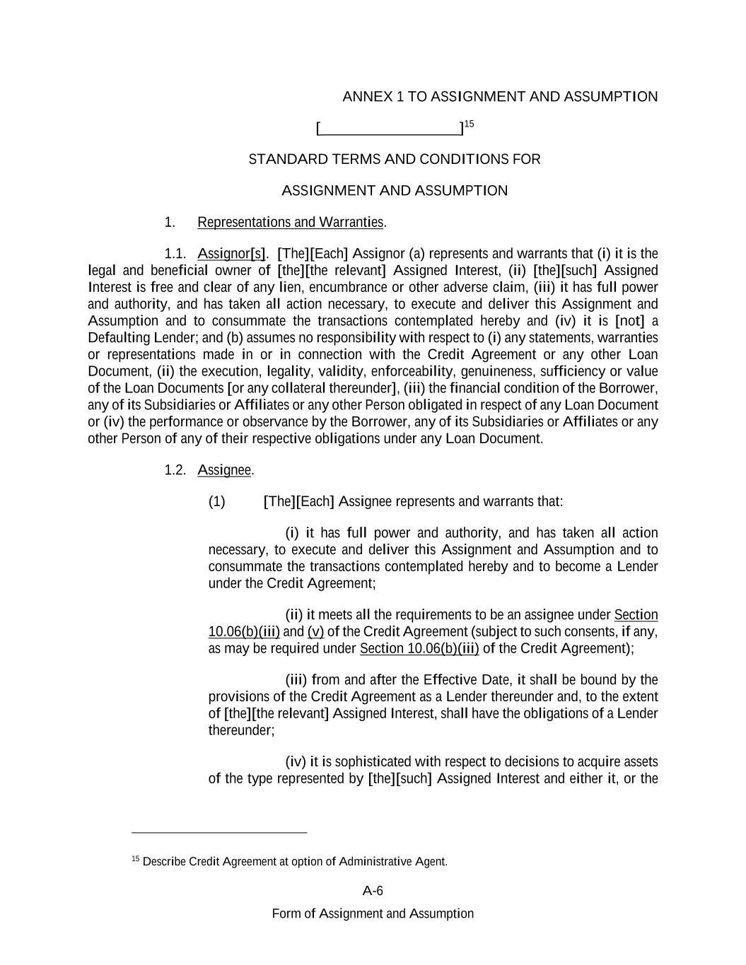 A-6 Form of Assignment and Assumption ANNEX 1 TO ASSIGNMENT AND ASSUMPTION [___________________]15 STANDARD TERMS AND CONDITIONS FOR ASSIGNMENT AND ASSUMPTION 1. Representations and Warranties. 1.1. Assignor[s]. [The][Each] Assignor (a) represents and warrants that (i) it is the legal and beneficial owner of [the][the relevant] Assigned Interest, (ii) [the][such] Assigned Interest is free and clear of any lien, encumbrance or other adverse claim, (iii) it has full power and authority, and has taken all action necessary, to execute and deliver this Assignment and Assumption and to consummate the transactions contemplated hereby and (iv) it is [not] a Defaulting Lender; and (b) assumes no responsibility with respect to (i) any statements, warranties or representations made in or in connection with the Credit Agreement or any other Loan Document, (ii) the execution, legality, validity, enforceability, genuineness, sufficiency or value of the Loan Documents [or any collateral thereunder], (iii) the financial condition of the Borrower, any of its Subsidiaries or Affiliates or any other Person obligated in respect of any Loan Document or (iv) the performance or observance by the Borrower, any of its Subsidiaries or Affiliates or any other Person of any of their respective obligations under any Loan Document. 1.2. Assignee. (1) [The][Each] Assignee represents and warrants that: (i) it has full power and authority, and has taken all action necessary, to execute and deliver this Assignment and Assumption and to consummate the transactions contemplated hereby and to become a Lender under the Credit Agreement; (ii) it meets all the requirements to be an assignee under Section 10.06(b)(iii) and (v) of the Credit Agreement (subject to such consents, if any, as may be required under Section 10.06(b)(iii) of the Credit Agreement); (iii) from and after the Effective Date, it shall be bound by the provisions of the Credit Agreement as a Lender thereunder and, to the extent of [the][the relevant] Assigned Interest, shall have the obligations of a Lender thereunder; (iv) it is sophisticated with respect to decisions to acquire assets of the type represented by [the][such] Assigned Interest and either it, or the 15 Describe Credit Agreement at option of Administrative Agent.