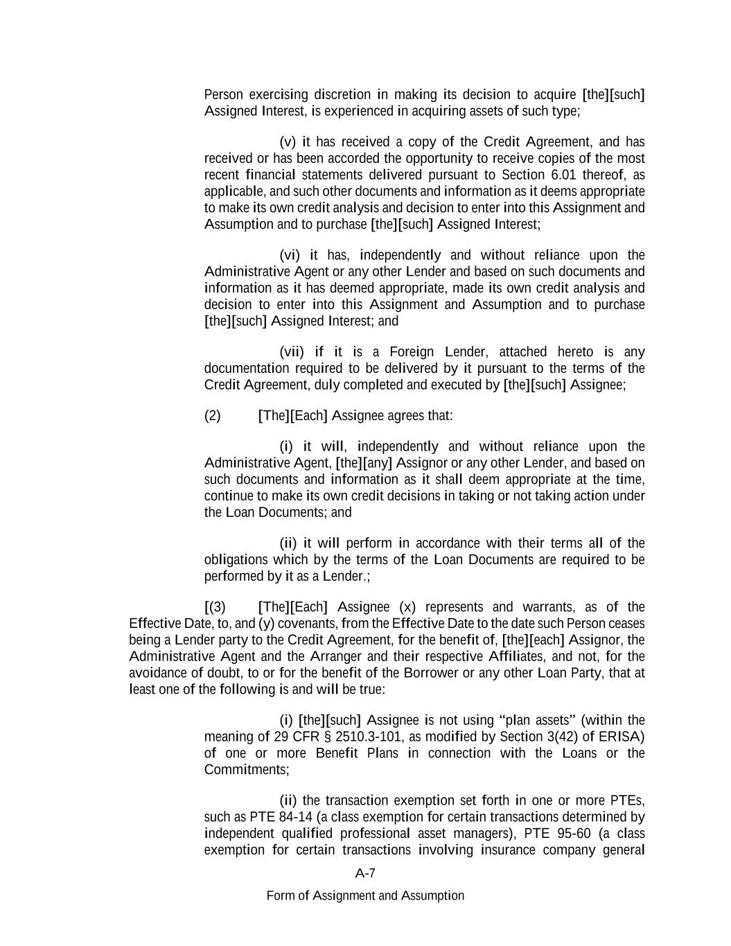 A-7 Form of Assignment and Assumption Person exercising discretion in making its decision to acquire [the][such] Assigned Interest, is experienced in acquiring assets of such type; (v) it has received a copy of the Credit Agreement, and has received or has been accorded the opportunity to receive copies of the most recent financial statements delivered pursuant to Section 6.01 thereof, as applicable, and such other documents and information as it deems appropriate to make its own credit analysis and decision to enter into this Assignment and Assumption and to purchase [the][such] Assigned Interest; (vi) it has, independently and without reliance upon the Administrative Agent or any other Lender and based on such documents and information as it has deemed appropriate, made its own credit analysis and decision to enter into this Assignment and Assumption and to purchase [the][such] Assigned Interest; and (vii) if it is a Foreign Lender, attached hereto is any documentation required to be delivered by it pursuant to the terms of the Credit Agreement, duly completed and executed by [the][such] Assignee; (2) [The][Each] Assignee agrees that: (i) it will, independently and without reliance upon the Administrative Agent, [the][any] Assignor or any other Lender, and based on such documents and information as it shall deem appropriate at the time, continue to make its own credit decisions in taking or not taking action under the Loan Documents; and (ii) it will perform in accordance with their terms all of the obligations which by the terms of the Loan Documents are required to be performed by it as a Lender.; [(3) [The][Each] Assignee (x) represents and warrants, as of the Effective Date, to, and (y) covenants, from the Effective Date to the date such Person ceases being a Lender party to the Credit Agreement, for the benefit of, [the][each] Assignor, the Administrative Agent and the Arranger and their respective Affiliates, and not, for the avoidance of doubt, to or for the benefit of the Borrower or any other Loan Party, that at least one of the following is and will be true: (i) [the][such] Assignee is not using “plan assets” (within the meaning of 29 CFR § 2510.3-101, as modified by Section 3(42) of ERISA) of one or more Benefit Plans in connection with the Loans or the Commitments; (ii) the transaction exemption set forth in one or more PTEs, such as PTE 84-14 (a class exemption for certain transactions determined by independent qualified professional asset managers), PTE 95-60 (a class exemption for certain transactions involving insurance company general
