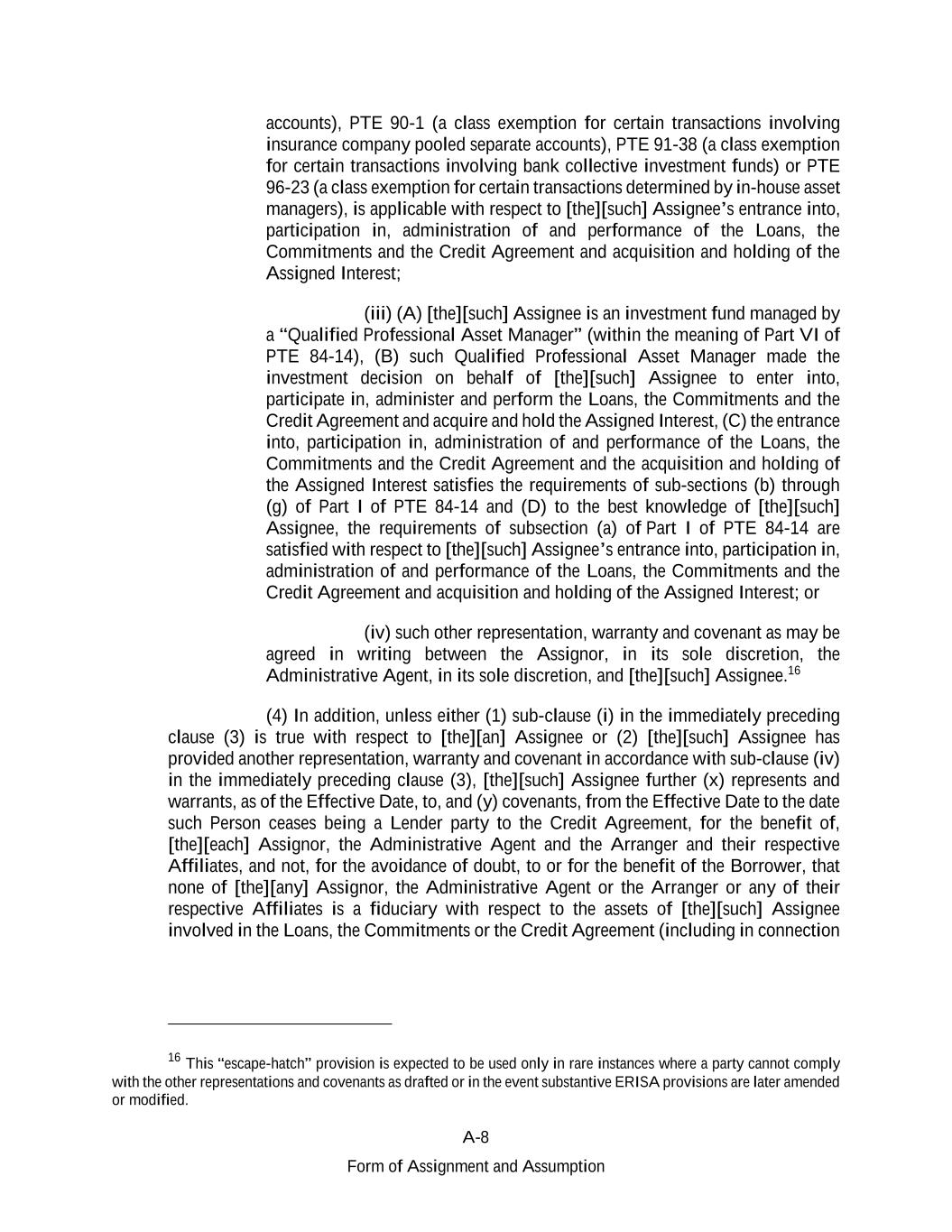 A-8 Form of Assignment and Assumption accounts), PTE 90-1 (a class exemption for certain transactions involving insurance company pooled separate accounts), PTE 91-38 (a class exemption for certain transactions involving bank collective investment funds) or PTE 96-23 (a class exemption for certain transactions determined by in-house asset managers), is applicable with respect to [the][such] Assignee’s entrance into, participation in, administration of and performance of the Loans, the Commitments and the Credit Agreement and acquisition and holding of the Assigned Interest; (iii) (A) [the][such] Assignee is an investment fund managed by a “Qualified Professional Asset Manager” (within the meaning of Part VI of PTE 84-14), (B) such Qualified Professional Asset Manager made the investment decision on behalf of [the][such] Assignee to enter into, participate in, administer and perform the Loans, the Commitments and the Credit Agreement and acquire and hold the Assigned Interest, (C) the entrance into, participation in, administration of and performance of the Loans, the Commitments and the Credit Agreement and the acquisition and holding of the Assigned Interest satisfies the requirements of sub-sections (b) through (g) of Part I of PTE 84-14 and (D) to the best knowledge of [the][such] Assignee, the requirements of subsection (a) of Part I of PTE 84-14 are satisfied with respect to [the][such] Assignee’s entrance into, participation in, administration of and performance of the Loans, the Commitments and the Credit Agreement and acquisition and holding of the Assigned Interest; or (iv) such other representation, warranty and covenant as may be agreed in writing between the Assignor, in its sole discretion, the Administrative Agent, in its sole discretion, and [the][such] Assignee.16 (4) In addition, unless either (1) sub-clause (i) in the immediately preceding clause (3) is true with respect to [the][an] Assignee or (2) [the][such] Assignee has provided another representation, warranty and covenant in accordance with sub-clause (iv) in the immediately preceding clause (3), [the][such] Assignee further (x) represents and warrants, as of the Effective Date, to, and (y) covenants, from the Effective Date to the date such Person ceases being a Lender party to the Credit Agreement, for the benefit of, [the][each] Assignor, the Administrative Agent and the Arranger and their respective Affiliates, and not, for the avoidance of doubt, to or for the benefit of the Borrower, that none of [the][any] Assignor, the Administrative Agent or the Arranger or any of their respective Affiliates is a fiduciary with respect to the assets of [the][such] Assignee involved in the Loans, the Commitments or the Credit Agreement (including in connection 16 This “escape-hatch” provision is expected to be used only in rare instances where a party cannot comply with the other representations and covenants as drafted or in the event substantive ERISA provisions are later amended or modified.