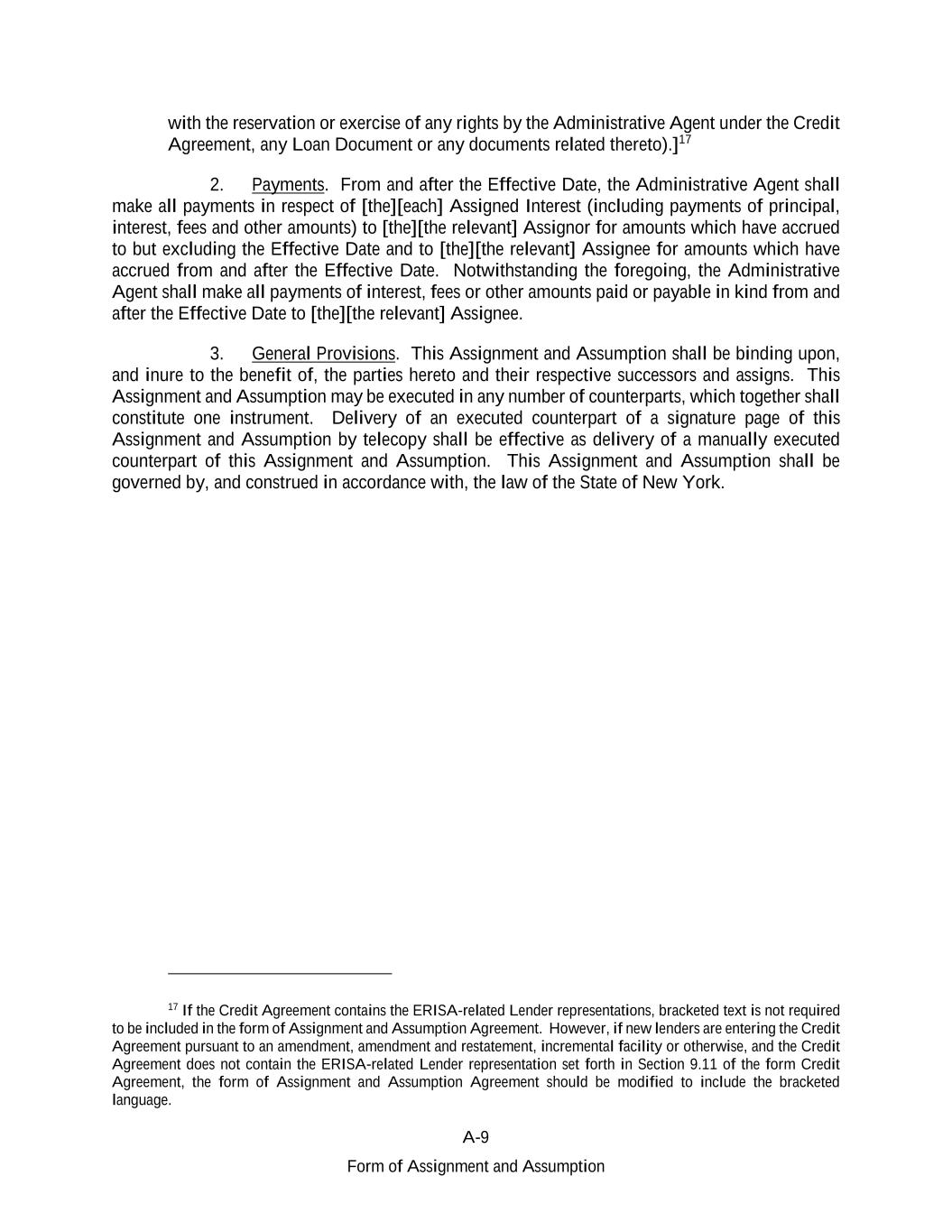 A-9 Form of Assignment and Assumption with the reservation or exercise of any rights by the Administrative Agent under the Credit Agreement, any Loan Document or any documents related thereto).]17 2. Payments. From and after the Effective Date, the Administrative Agent shall make all payments in respect of [the][each] Assigned Interest (including payments of principal, interest, fees and other amounts) to [the][the relevant] Assignor for amounts which have accrued to but excluding the Effective Date and to [the][the relevant] Assignee for amounts which have accrued from and after the Effective Date. Notwithstanding the foregoing, the Administrative Agent shall make all payments of interest, fees or other amounts paid or payable in kind from and after the Effective Date to [the][the relevant] Assignee. 3. General Provisions. This Assignment and Assumption shall be binding upon, and inure to the benefit of, the parties hereto and their respective successors and assigns. This Assignment and Assumption may be executed in any number of counterparts, which together shall constitute one instrument. Delivery of an executed counterpart of a signature page of this Assignment and Assumption by telecopy shall be effective as delivery of a manually executed counterpart of this Assignment and Assumption. This Assignment and Assumption shall be governed by, and construed in accordance with, the law of the State of New York. 17 If the Credit Agreement contains the ERISA-related Lender representations, bracketed text is not required to be included in the form of Assignment and Assumption Agreement. However, if new lenders are entering the Credit Agreement pursuant to an amendment, amendment and restatement, incremental facility or otherwise, and the Credit Agreement does not contain the ERISA-related Lender representation set forth in Section 9.11 of the form Credit Agreement, the form of Assignment and Assumption Agreement should be modified to include the bracketed language.