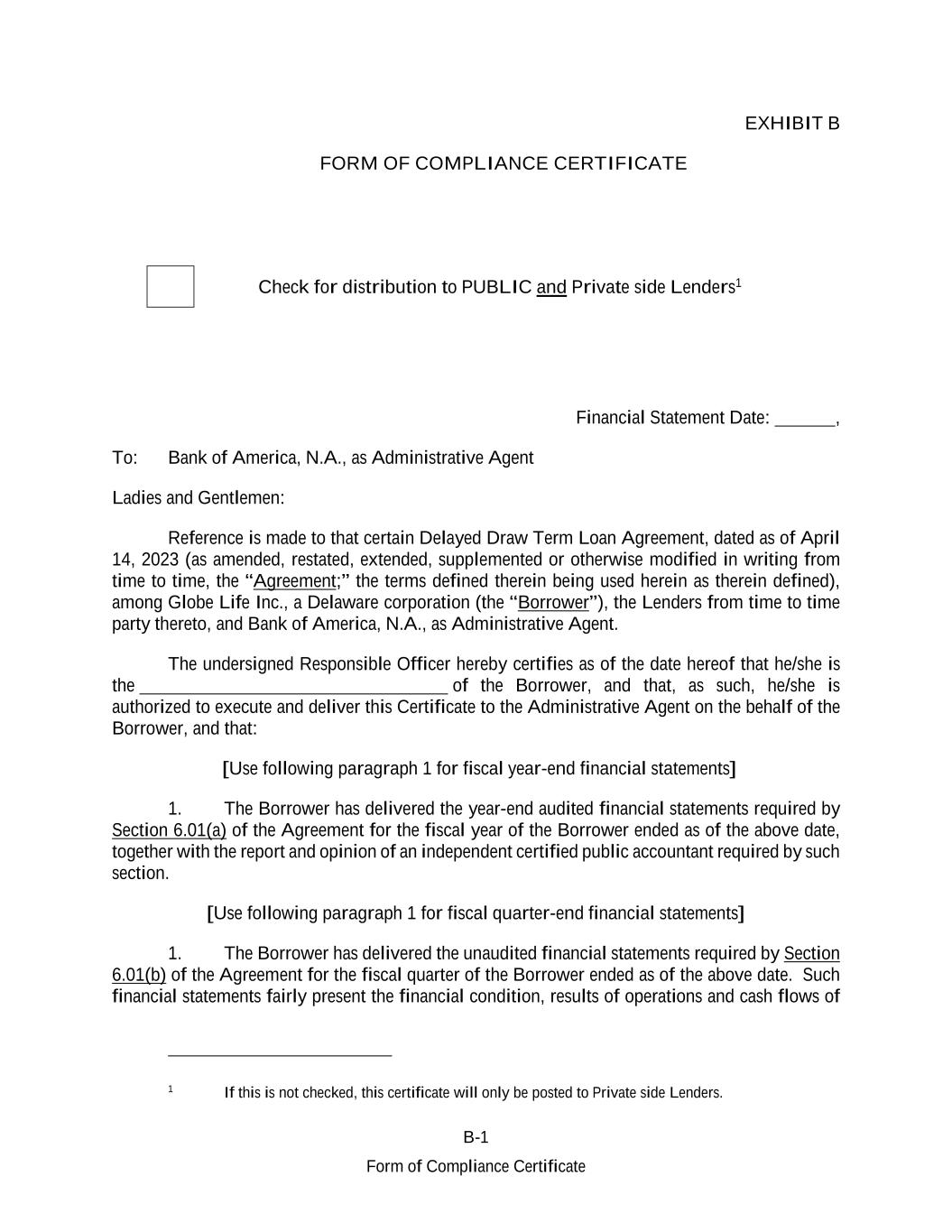 B-1 Form of Compliance Certificate EXHIBIT B FORM OF COMPLIANCE CERTIFICATE Check for distribution to PUBLIC and Private side Lenders1 Financial Statement Date: , To: Bank of America, N.A., as Administrative Agent Ladies and Gentlemen: Reference is made to that certain Delayed Draw Term Loan Agreement, dated as of April 14, 2023 (as amended, restated, extended, supplemented or otherwise modified in writing from time to time, the “Agreement;” the terms defined therein being used herein as therein defined), among Globe Life Inc., a Delaware corporation (the “Borrower”), the Lenders from time to time party thereto, and Bank of America, N.A., as Administrative Agent. The undersigned Responsible Officer hereby certifies as of the date hereof that he/she is the of the Borrower, and that, as such, he/she is authorized to execute and deliver this Certificate to the Administrative Agent on the behalf of the Borrower, and that: [Use following paragraph 1 for fiscal year-end financial statements] 1. The Borrower has delivered the year-end audited financial statements required by Section 6.01(a) of the Agreement for the fiscal year of the Borrower ended as of the above date, together with the report and opinion of an independent certified public accountant required by such section. [Use following paragraph 1 for fiscal quarter-end financial statements] 1. The Borrower has delivered the unaudited financial statements required by Section 6.01(b) of the Agreement for the fiscal quarter of the Borrower ended as of the above date. Such financial statements fairly present the financial condition, results of operations and cash flows of 1 If this is not checked, this certificate will only be posted to Private side Lenders.