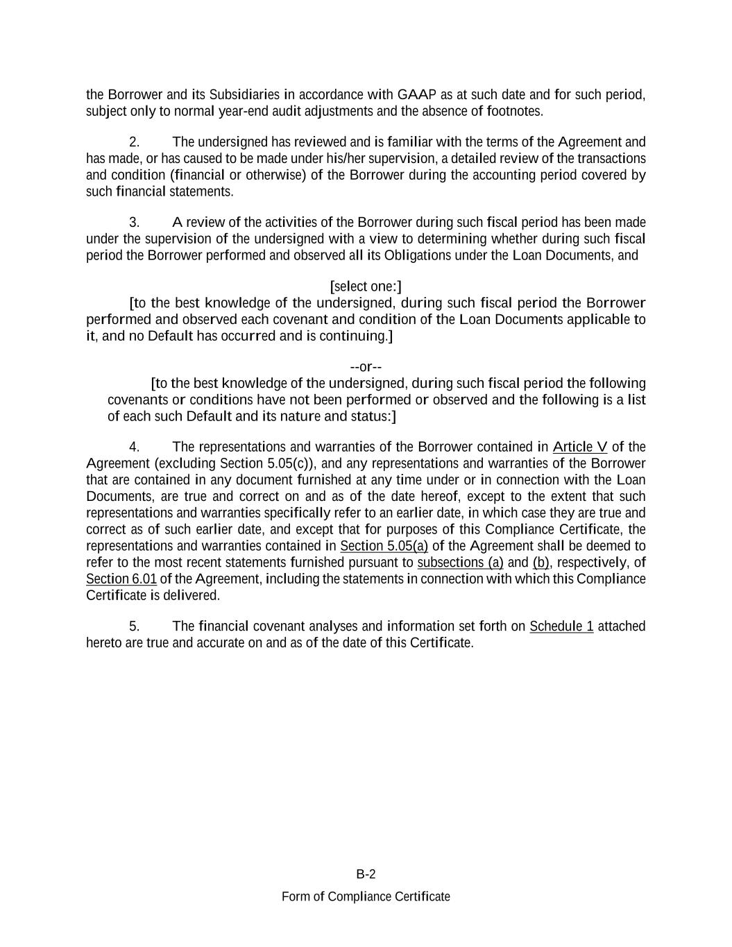 B-2 Form of Compliance Certificate the Borrower and its Subsidiaries in accordance with GAAP as at such date and for such period, subject only to normal year-end audit adjustments and the absence of footnotes. 2. The undersigned has reviewed and is familiar with the terms of the Agreement and has made, or has caused to be made under his/her supervision, a detailed review of the transactions and condition (financial or otherwise) of the Borrower during the accounting period covered by such financial statements. 3. A review of the activities of the Borrower during such fiscal period has been made under the supervision of the undersigned with a view to determining whether during such fiscal period the Borrower performed and observed all its Obligations under the Loan Documents, and [select one:] [to the best knowledge of the undersigned, during such fiscal period the Borrower performed and observed each covenant and condition of the Loan Documents applicable to it, and no Default has occurred and is continuing.] --or-- [to the best knowledge of the undersigned, during such fiscal period the following covenants or conditions have not been performed or observed and the following is a list of each such Default and its nature and status:] 4. The representations and warranties of the Borrower contained in Article V of the Agreement (excluding Section 5.05(c)), and any representations and warranties of the Borrower that are contained in any document furnished at any time under or in connection with the Loan Documents, are true and correct on and as of the date hereof, except to the extent that such representations and warranties specifically refer to an earlier date, in which case they are true and correct as of such earlier date, and except that for purposes of this Compliance Certificate, the representations and warranties contained in Section 5.05(a) of the Agreement shall be deemed to refer to the most recent statements furnished pursuant to subsections (a) and (b), respectively, of Section 6.01 of the Agreement, including the statements in connection with which this Compliance Certificate is delivered. 5. The financial covenant analyses and information set forth on Schedule 1 attached hereto are true and accurate on and as of the date of this Certificate.