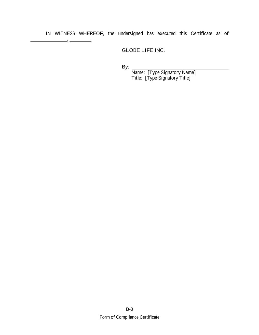 B-3 Form of Compliance Certificate IN WITNESS WHEREOF, the undersigned has executed this Certificate as of , . GLOBE LIFE INC. By: Name: [Type Signatory Name] Title: [Type Signatory Title]