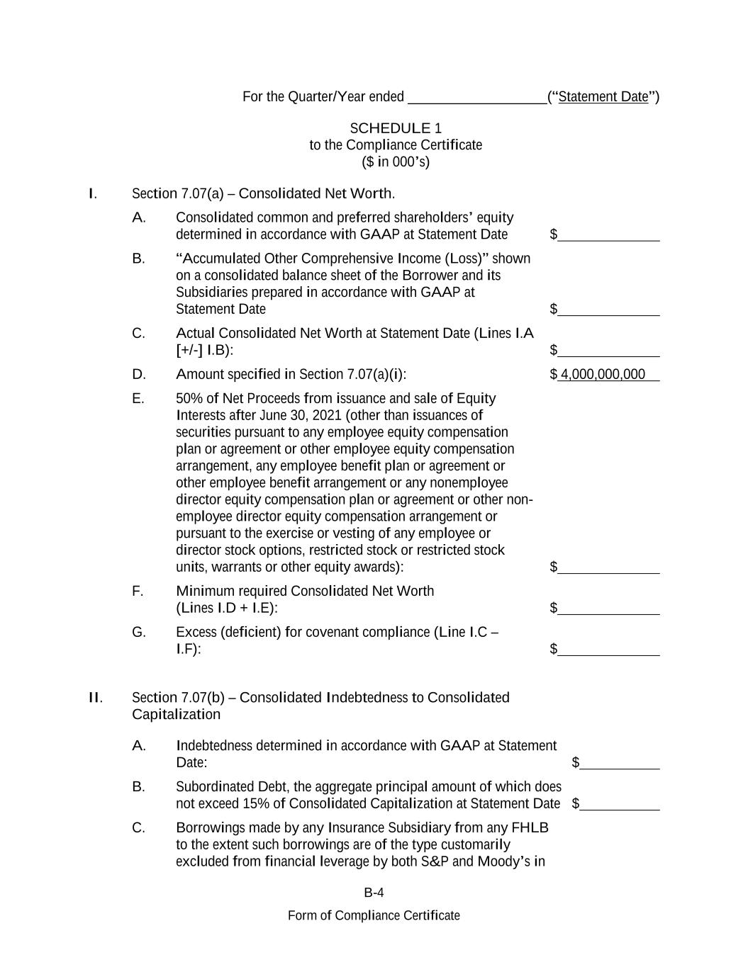 B-4 Form of Compliance Certificate For the Quarter/Year ended ___________________(“Statement Date”) SCHEDULE 1 to the Compliance Certificate ($ in 000’s) I. Section 7.07(a) – Consolidated Net Worth. A. Consolidated common and preferred shareholders’ equity determined in accordance with GAAP at Statement Date $ B. “Accumulated Other Comprehensive Income (Loss)” shown on a consolidated balance sheet of the Borrower and its Subsidiaries prepared in accordance with GAAP at Statement Date $ C. Actual Consolidated Net Worth at Statement Date (Lines I.A [+/-] I.B): $ D. Amount specified in Section 7.07(a)(i): $ 4,000,000,000 E. 50% of Net Proceeds from issuance and sale of Equity Interests after June 30, 2021 (other than issuances of securities pursuant to any employee equity compensation plan or agreement or other employee equity compensation arrangement, any employee benefit plan or agreement or other employee benefit arrangement or any nonemployee director equity compensation plan or agreement or other non- employee director equity compensation arrangement or pursuant to the exercise or vesting of any employee or director stock options, restricted stock or restricted stock units, warrants or other equity awards): $ F. Minimum required Consolidated Net Worth (Lines I.D + I.E): $ G. Excess (deficient) for covenant compliance (Line I.C – I.F): $ II. Section 7.07(b) – Consolidated Indebtedness to Consolidated Capitalization A. Indebtedness determined in accordance with GAAP at Statement Date: $ B. Subordinated Debt, the aggregate principal amount of which does not exceed 15% of Consolidated Capitalization at Statement Date $ C. Borrowings made by any Insurance Subsidiary from any FHLB to the extent such borrowings are of the type customarily excluded from financial leverage by both S&P and Moody’s in
