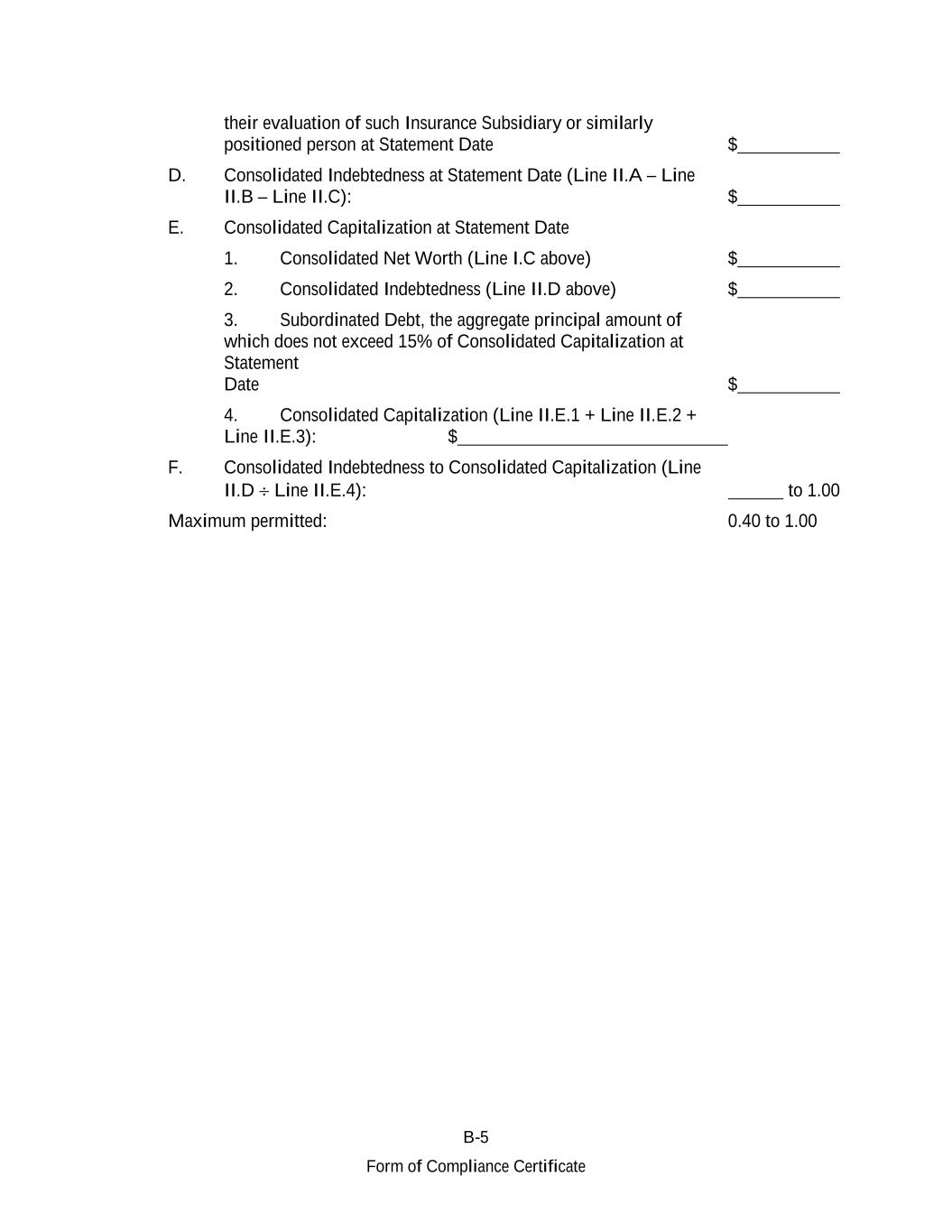 B-5 Form of Compliance Certificate their evaluation of such Insurance Subsidiary or similarly positioned person at Statement Date $ D. Consolidated Indebtedness at Statement Date (Line II.A – Line II.B – Line II.C): $ E. Consolidated Capitalization at Statement Date 1. Consolidated Net Worth (Line I.C above) $ 2. Consolidated Indebtedness (Line II.D above) $ 3. Subordinated Debt, the aggregate principal amount of which does not exceed 15% of Consolidated Capitalization at Statement Date $ 4. Consolidated Capitalization (Line II.E.1 + Line II.E.2 + Line II.E.3): $ F. Consolidated Indebtedness to Consolidated Capitalization (Line II.D  Line II.E.4): to 1.00 Maximum permitted: 0.40 to 1.00