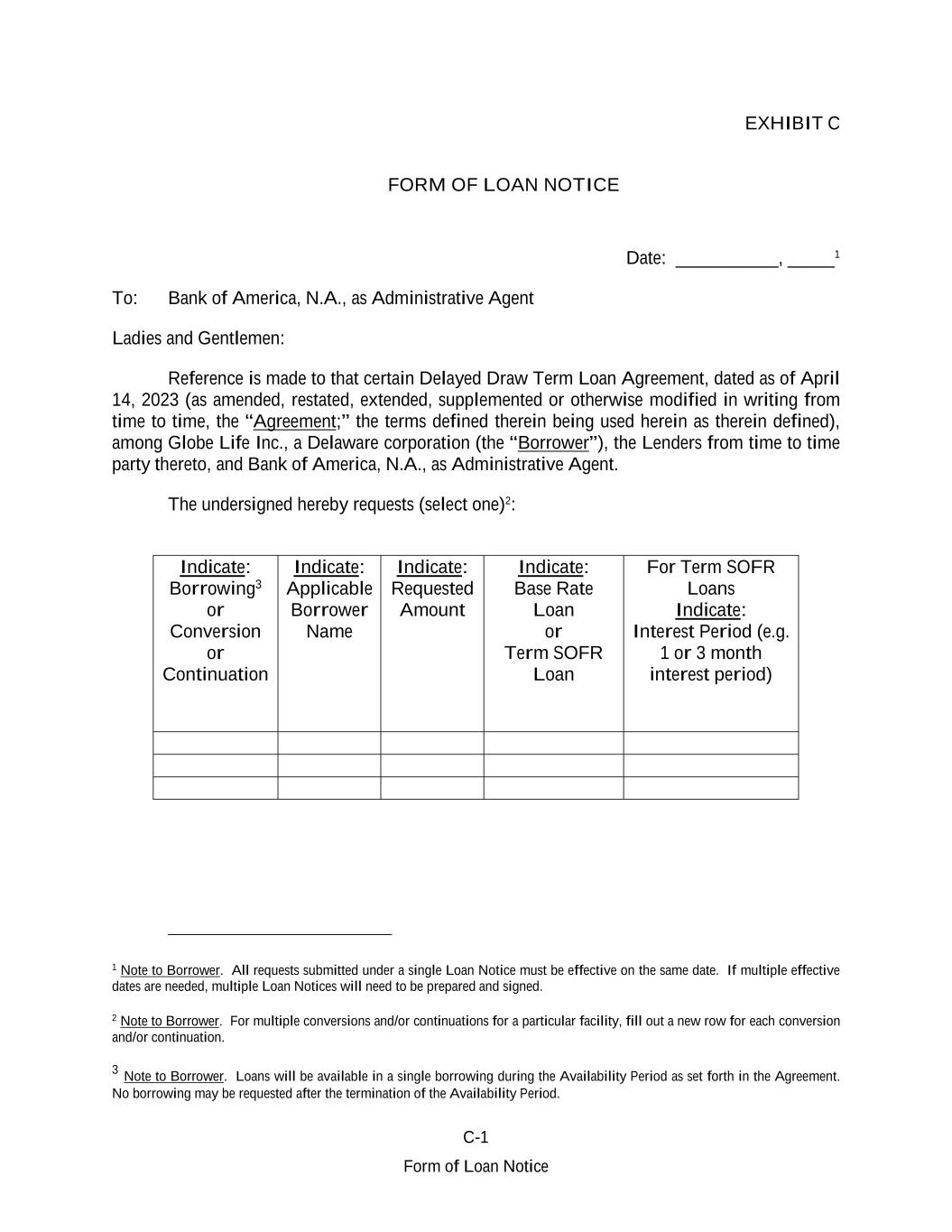 C-1 Form of Loan Notice EXHIBIT C FORM OF LOAN NOTICE Date: ___________, _____1 To: Bank of America, N.A., as Administrative Agent Ladies and Gentlemen: Reference is made to that certain Delayed Draw Term Loan Agreement, dated as of April 14, 2023 (as amended, restated, extended, supplemented or otherwise modified in writing from time to time, the “Agreement;” the terms defined therein being used herein as therein defined), among Globe Life Inc., a Delaware corporation (the “Borrower”), the Lenders from time to time party thereto, and Bank of America, N.A., as Administrative Agent. The undersigned hereby requests (select one)2: Indicate: Borrowing3 or Conversion or Continuation Indicate: Applicable Borrower Name Indicate: Requested Amount Indicate: Base Rate Loan or Term SOFR Loan For Term SOFR Loans Indicate: Interest Period (e.g. 1 or 3 month interest period) 1 Note to Borrower. All requests submitted under a single Loan Notice must be effective on the same date. If multiple effective dates are needed, multiple Loan Notices will need to be prepared and signed. 2 Note to Borrower. For multiple conversions and/or continuations for a particular facility, fill out a new row for each conversion and/or continuation. 3 Note to Borrower. Loans will be available in a single borrowing during the Availability Period as set forth in the Agreement. No borrowing may be requested after the termination of the Availability Period.