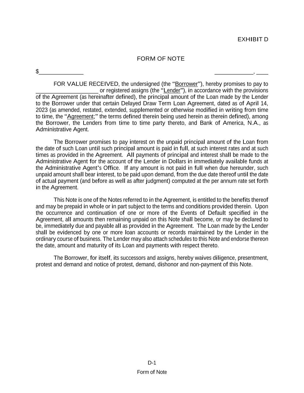 D-1 Form of Note EXHIBIT D FORM OF NOTE $_______________ _____________, ____ FOR VALUE RECEIVED, the undersigned (the “Borrower”), hereby promises to pay to _____________________ or registered assigns (the “Lender”), in accordance with the provisions of the Agreement (as hereinafter defined), the principal amount of the Loan made by the Lender to the Borrower under that certain Delayed Draw Term Loan Agreement, dated as of April 14, 2023 (as amended, restated, extended, supplemented or otherwise modified in writing from time to time, the “Agreement;” the terms defined therein being used herein as therein defined), among the Borrower, the Lenders from time to time party thereto, and Bank of America, N.A., as Administrative Agent. The Borrower promises to pay interest on the unpaid principal amount of the Loan from the date of such Loan until such principal amount is paid in full, at such interest rates and at such times as provided in the Agreement. All payments of principal and interest shall be made to the Administrative Agent for the account of the Lender in Dollars in immediately available funds at the Administrative Agent’s Office. If any amount is not paid in full when due hereunder, such unpaid amount shall bear interest, to be paid upon demand, from the due date thereof until the date of actual payment (and before as well as after judgment) computed at the per annum rate set forth in the Agreement. This Note is one of the Notes referred to in the Agreement, is entitled to the benefits thereof and may be prepaid in whole or in part subject to the terms and conditions provided therein. Upon the occurrence and continuation of one or more of the Events of Default specified in the Agreement, all amounts then remaining unpaid on this Note shall become, or may be declared to be, immediately due and payable all as provided in the Agreement. The Loan made by the Lender shall be evidenced by one or more loan accounts or records maintained by the Lender in the ordinary course of business. The Lender may also attach schedules to this Note and endorse thereon the date, amount and maturity of its Loan and payments with respect thereto. The Borrower, for itself, its successors and assigns, hereby waives diligence, presentment, protest and demand and notice of protest, demand, dishonor and non-payment of this Note.