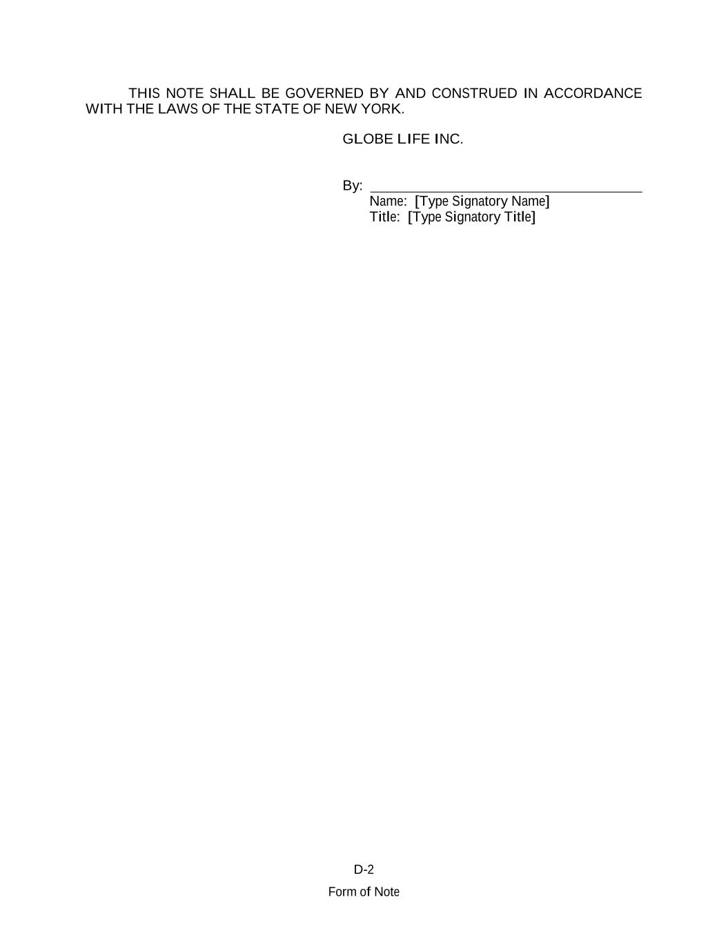 D-2 Form of Note THIS NOTE SHALL BE GOVERNED BY AND CONSTRUED IN ACCORDANCE WITH THE LAWS OF THE STATE OF NEW YORK. GLOBE LIFE INC. By: Name: [Type Signatory Name] Title: [Type Signatory Title]