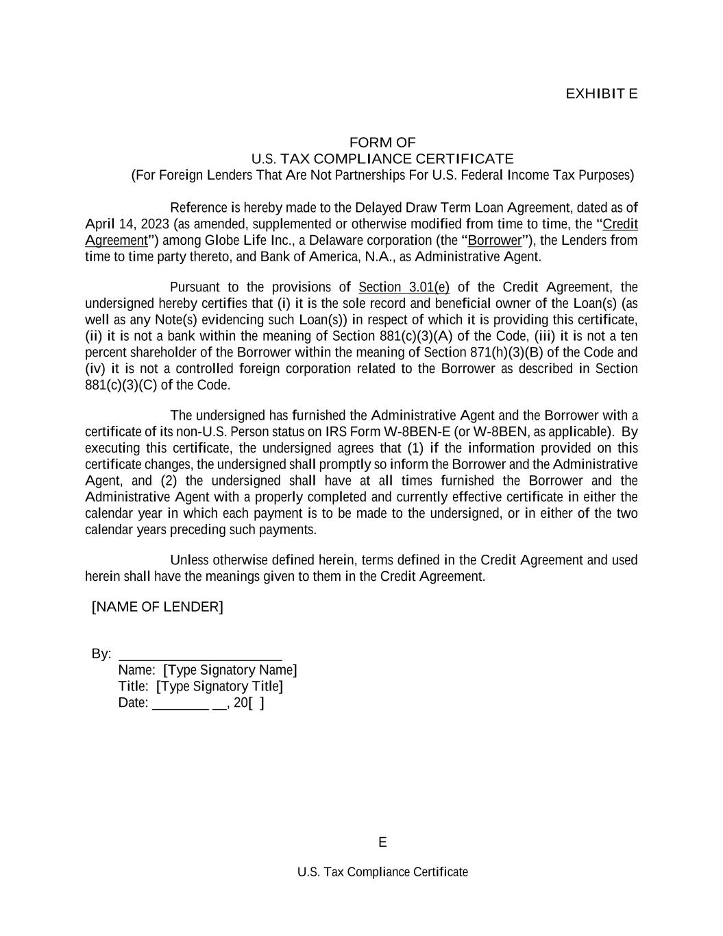 E U.S. Tax Compliance Certificate EXHIBIT E FORM OF U.S. TAX COMPLIANCE CERTIFICATE (For Foreign Lenders That Are Not Partnerships For U.S. Federal Income Tax Purposes) Reference is hereby made to the Delayed Draw Term Loan Agreement, dated as of April 14, 2023 (as amended, supplemented or otherwise modified from time to time, the “Credit Agreement”) among Globe Life Inc., a Delaware corporation (the “Borrower”), the Lenders from time to time party thereto, and Bank of America, N.A., as Administrative Agent. Pursuant to the provisions of Section 3.01(e) of the Credit Agreement, the undersigned hereby certifies that (i) it is the sole record and beneficial owner of the Loan(s) (as well as any Note(s) evidencing such Loan(s)) in respect of which it is providing this certificate, (ii) it is not a bank within the meaning of Section 881(c)(3)(A) of the Code, (iii) it is not a ten percent shareholder of the Borrower within the meaning of Section 871(h)(3)(B) of the Code and (iv) it is not a controlled foreign corporation related to the Borrower as described in Section 881(c)(3)(C) of the Code. The undersigned has furnished the Administrative Agent and the Borrower with a certificate of its non-U.S. Person status on IRS Form W-8BEN-E (or W-8BEN, as applicable). By executing this certificate, the undersigned agrees that (1) if the information provided on this certificate changes, the undersigned shall promptly so inform the Borrower and the Administrative Agent, and (2) the undersigned shall have at all times furnished the Borrower and the Administrative Agent with a properly completed and currently effective certificate in either the calendar year in which each payment is to be made to the undersigned, or in either of the two calendar years preceding such payments. Unless otherwise defined herein, terms defined in the Credit Agreement and used herein shall have the meanings given to them in the Credit Agreement. [NAME OF LENDER] By: _______________________ Name: [Type Signatory Name] Title: [Type Signatory Title] Date: ________ __, 20[ ]