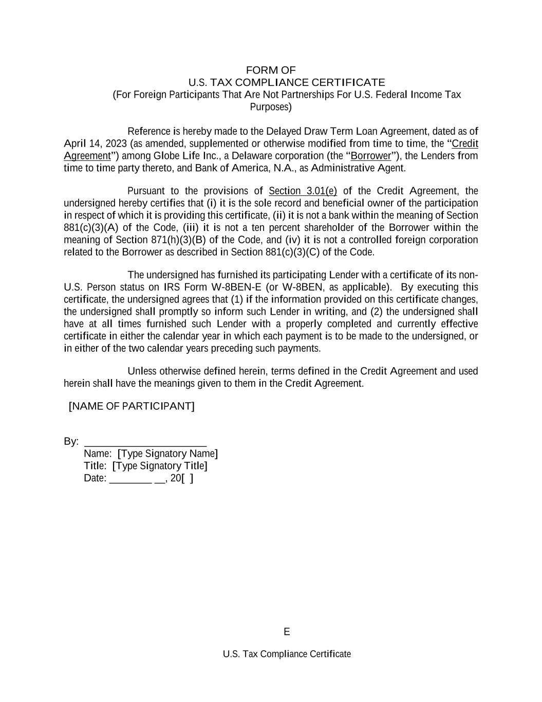 E U.S. Tax Compliance Certificate FORM OF U.S. TAX COMPLIANCE CERTIFICATE (For Foreign Participants That Are Not Partnerships For U.S. Federal Income Tax Purposes) Reference is hereby made to the Delayed Draw Term Loan Agreement, dated as of April 14, 2023 (as amended, supplemented or otherwise modified from time to time, the “Credit Agreement”) among Globe Life Inc., a Delaware corporation (the “Borrower”), the Lenders from time to time party thereto, and Bank of America, N.A., as Administrative Agent. Pursuant to the provisions of Section 3.01(e) of the Credit Agreement, the undersigned hereby certifies that (i) it is the sole record and beneficial owner of the participation in respect of which it is providing this certificate, (ii) it is not a bank within the meaning of Section 881(c)(3)(A) of the Code, (iii) it is not a ten percent shareholder of the Borrower within the meaning of Section 871(h)(3)(B) of the Code, and (iv) it is not a controlled foreign corporation related to the Borrower as described in Section 881(c)(3)(C) of the Code. The undersigned has furnished its participating Lender with a certificate of its non- U.S. Person status on IRS Form W-8BEN-E (or W-8BEN, as applicable). By executing this certificate, the undersigned agrees that (1) if the information provided on this certificate changes, the undersigned shall promptly so inform such Lender in writing, and (2) the undersigned shall have at all times furnished such Lender with a properly completed and currently effective certificate in either the calendar year in which each payment is to be made to the undersigned, or in either of the two calendar years preceding such payments. Unless otherwise defined herein, terms defined in the Credit Agreement and used herein shall have the meanings given to them in the Credit Agreement. [NAME OF PARTICIPANT] By: _______________________ Name: [Type Signatory Name] Title: [Type Signatory Title] Date: ________ __, 20[ ]