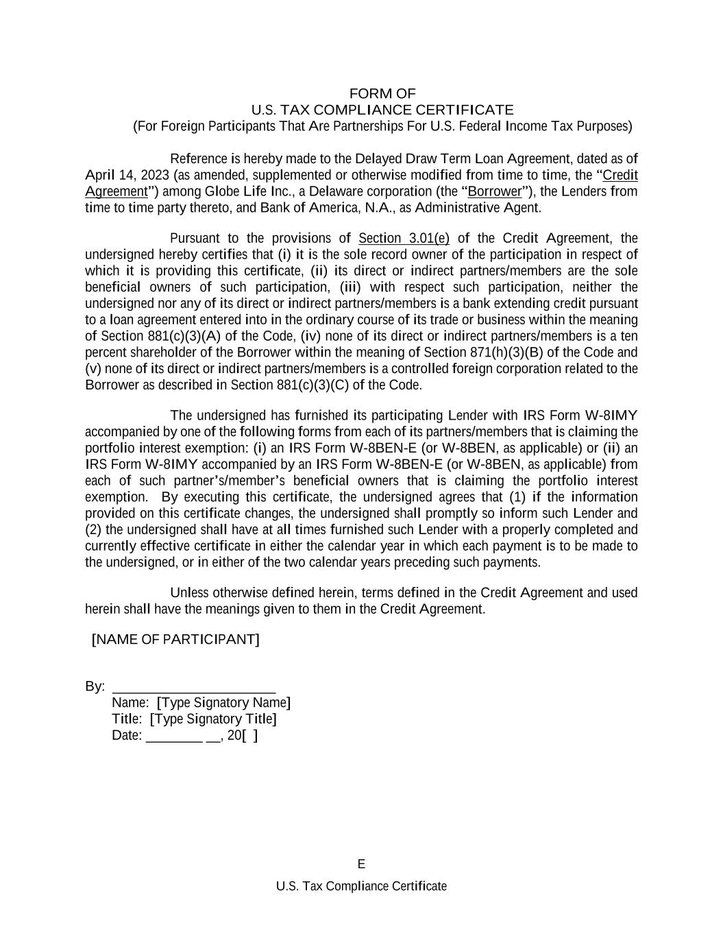 E U.S. Tax Compliance Certificate FORM OF U.S. TAX COMPLIANCE CERTIFICATE (For Foreign Participants That Are Partnerships For U.S. Federal Income Tax Purposes) Reference is hereby made to the Delayed Draw Term Loan Agreement, dated as of April 14, 2023 (as amended, supplemented or otherwise modified from time to time, the “Credit Agreement”) among Globe Life Inc., a Delaware corporation (the “Borrower”), the Lenders from time to time party thereto, and Bank of America, N.A., as Administrative Agent. Pursuant to the provisions of Section 3.01(e) of the Credit Agreement, the undersigned hereby certifies that (i) it is the sole record owner of the participation in respect of which it is providing this certificate, (ii) its direct or indirect partners/members are the sole beneficial owners of such participation, (iii) with respect such participation, neither the undersigned nor any of its direct or indirect partners/members is a bank extending credit pursuant to a loan agreement entered into in the ordinary course of its trade or business within the meaning of Section 881(c)(3)(A) of the Code, (iv) none of its direct or indirect partners/members is a ten percent shareholder of the Borrower within the meaning of Section 871(h)(3)(B) of the Code and (v) none of its direct or indirect partners/members is a controlled foreign corporation related to the Borrower as described in Section 881(c)(3)(C) of the Code. The undersigned has furnished its participating Lender with IRS Form W-8IMY accompanied by one of the following forms from each of its partners/members that is claiming the portfolio interest exemption: (i) an IRS Form W-8BEN-E (or W-8BEN, as applicable) or (ii) an IRS Form W-8IMY accompanied by an IRS Form W-8BEN-E (or W-8BEN, as applicable) from each of such partner’s/member’s beneficial owners that is claiming the portfolio interest exemption. By executing this certificate, the undersigned agrees that (1) if the information provided on this certificate changes, the undersigned shall promptly so inform such Lender and (2) the undersigned shall have at all times furnished such Lender with a properly completed and currently effective certificate in either the calendar year in which each payment is to be made to the undersigned, or in either of the two calendar years preceding such payments. Unless otherwise defined herein, terms defined in the Credit Agreement and used herein shall have the meanings given to them in the Credit Agreement. [NAME OF PARTICIPANT] By: _______________________ Name: [Type Signatory Name] Title: [Type Signatory Title] Date: ________ __, 20[ ]