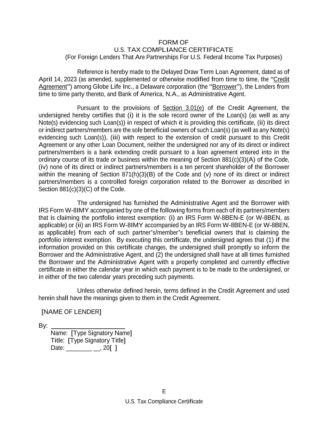 E U.S. Tax Compliance Certificate FORM OF U.S. TAX COMPLIANCE CERTIFICATE (For Foreign Lenders That Are Partnerships For U.S. Federal Income Tax Purposes) Reference is hereby made to the Delayed Draw Term Loan Agreement, dated as of April 14, 2023 (as amended, supplemented or otherwise modified from time to time, the “Credit Agreement”) among Globe Life Inc., a Delaware corporation (the “Borrower”), the Lenders from time to time party thereto, and Bank of America, N.A., as Administrative Agent. Pursuant to the provisions of Section 3.01(e) of the Credit Agreement, the undersigned hereby certifies that (i) it is the sole record owner of the Loan(s) (as well as any Note(s) evidencing such Loan(s)) in respect of which it is providing this certificate, (ii) its direct or indirect partners/members are the sole beneficial owners of such Loan(s) (as well as any Note(s) evidencing such Loan(s)), (iii) with respect to the extension of credit pursuant to this Credit Agreement or any other Loan Document, neither the undersigned nor any of its direct or indirect partners/members is a bank extending credit pursuant to a loan agreement entered into in the ordinary course of its trade or business within the meaning of Section 881(c)(3)(A) of the Code, (iv) none of its direct or indirect partners/members is a ten percent shareholder of the Borrower within the meaning of Section 871(h)(3)(B) of the Code and (v) none of its direct or indirect partners/members is a controlled foreign corporation related to the Borrower as described in Section 881(c)(3)(C) of the Code. The undersigned has furnished the Administrative Agent and the Borrower with IRS Form W-8IMY accompanied by one of the following forms from each of its partners/members that is claiming the portfolio interest exemption: (i) an IRS Form W-8BEN-E (or W-8BEN, as applicable) or (ii) an IRS Form W-8IMY accompanied by an IRS Form W-8BEN-E (or W-8BEN, as applicable) from each of such partner’s/member’s beneficial owners that is claiming the portfolio interest exemption. By executing this certificate, the undersigned agrees that (1) if the information provided on this certificate changes, the undersigned shall promptly so inform the Borrower and the Administrative Agent, and (2) the undersigned shall have at all times furnished the Borrower and the Administrative Agent with a properly completed and currently effective certificate in either the calendar year in which each payment is to be made to the undersigned, or in either of the two calendar years preceding such payments. Unless otherwise defined herein, terms defined in the Credit Agreement and used herein shall have the meanings given to them in the Credit Agreement. [NAME OF LENDER] By: _______________________ Name: [Type Signatory Name] Title: [Type Signatory Title] Date: ________ __, 20[ ]