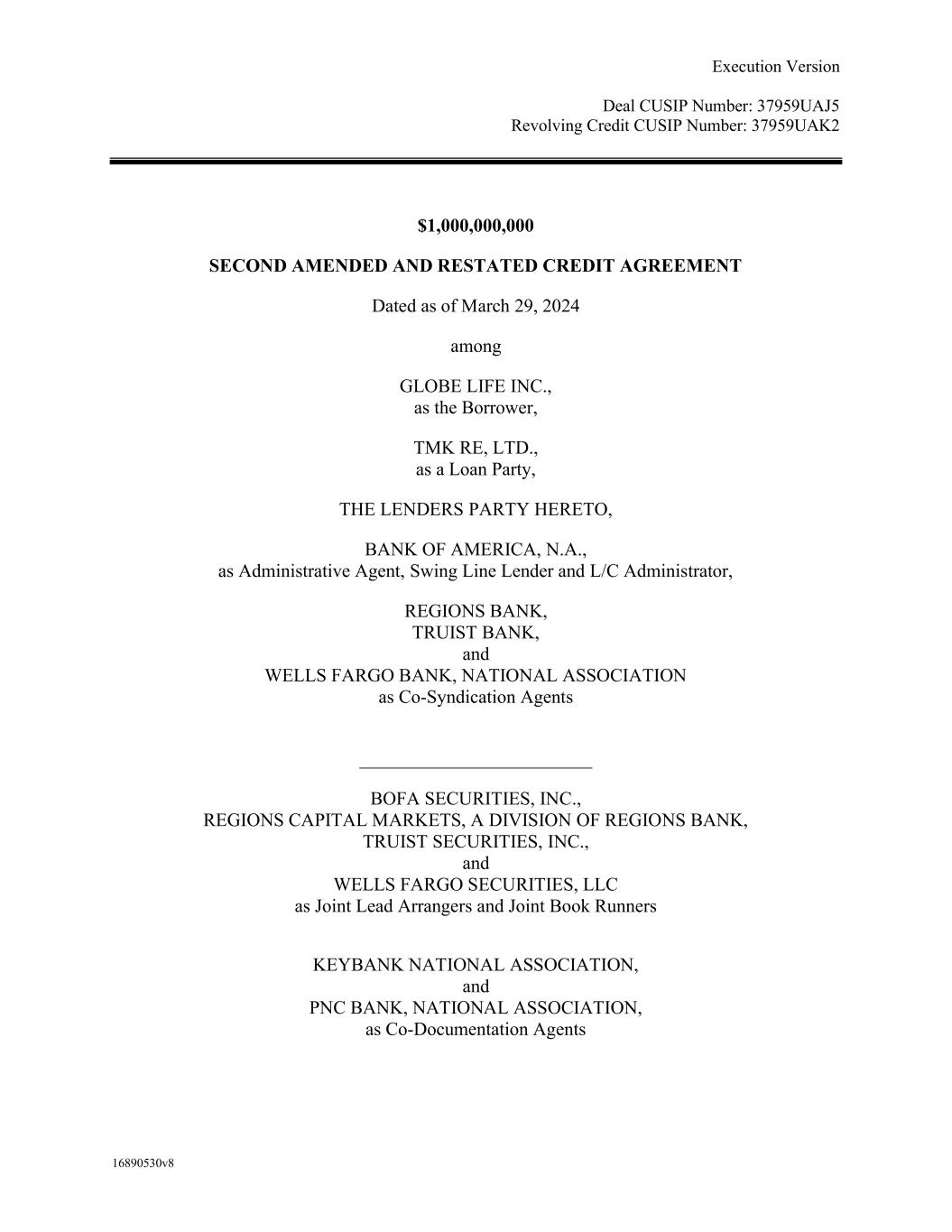 16890530v8 Execution Version Deal CUSIP Number: 37959UAJ5 Revolving Credit CUSIP Number: 37959UAK2 $1,000,000,000 SECOND AMENDED AND RESTATED CREDIT AGREEMENT Dated as of March 29, 2024 among GLOBE LIFE INC., as the Borrower, TMK RE, LTD., as a Loan Party, THE LENDERS PARTY HERETO, BANK OF AMERICA, N.A., as Administrative Agent, Swing Line Lender and L/C Administrator, REGIONS BANK, TRUIST BANK, and WELLS FARGO BANK, NATIONAL ASSOCIATION as Co-Syndication Agents _________________________ BOFA SECURITIES, INC., REGIONS CAPITAL MARKETS, A DIVISION OF REGIONS BANK, TRUIST SECURITIES, INC., and WELLS FARGO SECURITIES, LLC as Joint Lead Arrangers and Joint Book Runners KEYBANK NATIONAL ASSOCIATION, and PNC BANK, NATIONAL ASSOCIATION, as Co-Documentation Agents