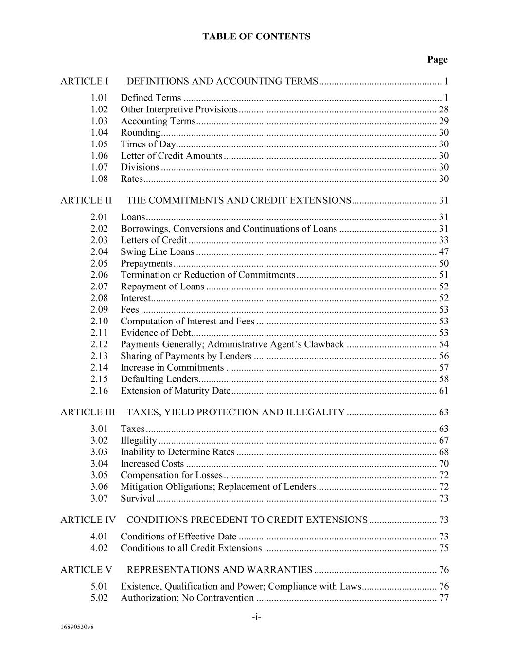 16890530v8 TABLE OF CONTENTS Page -i- ARTICLE I DEFINITIONS AND ACCOUNTING TERMS ................................................. 1 1.01 Defined Terms ....................................................................................................... 1 1.02 Other Interpretive Provisions ............................................................................... 28 1.03 Accounting Terms ................................................................................................ 29 1.04 Rounding .............................................................................................................. 30 1.05 Times of Day........................................................................................................ 30 1.06 Letter of Credit Amounts ..................................................................................... 30 1.07 Divisions .............................................................................................................. 30 1.08 Rates ..................................................................................................................... 30 ARTICLE II THE COMMITMENTS AND CREDIT EXTENSIONS .................................. 31 2.01 Loans .................................................................................................................... 31 2.02 Borrowings, Conversions and Continuations of Loans ....................................... 31 2.03 Letters of Credit ................................................................................................... 33 2.04 Swing Line Loans ................................................................................................ 47 2.05 Prepayments ......................................................................................................... 50 2.06 Termination or Reduction of Commitments ........................................................ 51 2.07 Repayment of Loans ............................................................................................ 52 2.08 Interest.................................................................................................................. 52 2.09 Fees ...................................................................................................................... 53 2.10 Computation of Interest and Fees ........................................................................ 53 2.11 Evidence of Debt.................................................................................................. 53 2.12 Payments Generally; Administrative Agent’s Clawback .................................... 54 2.13 Sharing of Payments by Lenders ......................................................................... 56 2.14 Increase in Commitments .................................................................................... 57 2.15 Defaulting Lenders............................................................................................... 58 2.16 Extension of Maturity Date .................................................................................. 61 ARTICLE III TAXES, YIELD PROTECTION AND ILLEGALITY .................................... 63 3.01 Taxes .................................................................................................................... 63 3.02 Illegality ............................................................................................................... 67 3.03 Inability to Determine Rates ................................................................................ 68 3.04 Increased Costs .................................................................................................... 70 3.05 Compensation for Losses ..................................................................................... 72 3.06 Mitigation Obligations; Replacement of Lenders ................................................ 72 3.07 Survival ................................................................................................................ 73 ARTICLE IV CONDITIONS PRECEDENT TO CREDIT EXTENSIONS ........................... 73 4.01 Conditions of Effective Date ............................................................................... 73 4.02 Conditions to all Credit Extensions ..................................................................... 75 ARTICLE V REPRESENTATIONS AND WARRANTIES ................................................. 76 5.01 Existence, Qualification and Power; Compliance with Laws .............................. 76 5.02 Authorization; No Contravention ........................................................................ 77