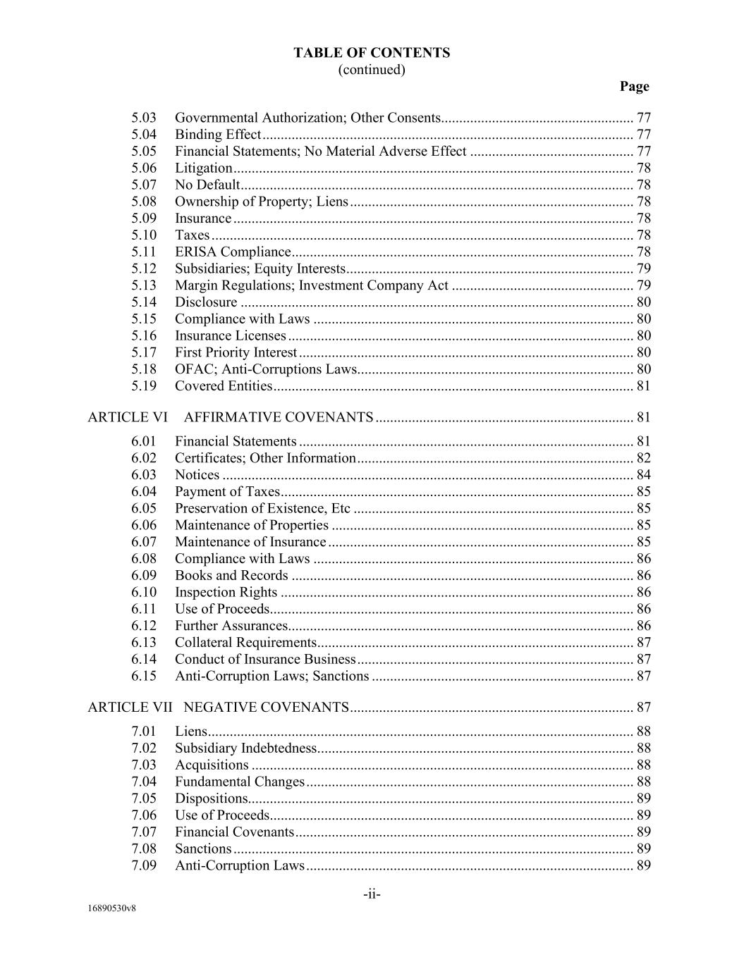 16890530v8 TABLE OF CONTENTS (continued) Page -ii- 5.03 Governmental Authorization; Other Consents..................................................... 77 5.04 Binding Effect ...................................................................................................... 77 5.05 Financial Statements; No Material Adverse Effect ............................................. 77 5.06 Litigation .............................................................................................................. 78 5.07 No Default ............................................................................................................ 78 5.08 Ownership of Property; Liens .............................................................................. 78 5.09 Insurance .............................................................................................................. 78 5.10 Taxes .................................................................................................................... 78 5.11 ERISA Compliance .............................................................................................. 78 5.12 Subsidiaries; Equity Interests ............................................................................... 79 5.13 Margin Regulations; Investment Company Act .................................................. 79 5.14 Disclosure ............................................................................................................ 80 5.15 Compliance with Laws ........................................................................................ 80 5.16 Insurance Licenses ............................................................................................... 80 5.17 First Priority Interest ............................................................................................ 80 5.18 OFAC; Anti-Corruptions Laws............................................................................ 80 5.19 Covered Entities ................................................................................................... 81 ARTICLE VI AFFIRMATIVE COVENANTS ....................................................................... 81 6.01 Financial Statements ............................................................................................ 81 6.02 Certificates; Other Information ............................................................................ 82 6.03 Notices ................................................................................................................. 84 6.04 Payment of Taxes ................................................................................................. 85 6.05 Preservation of Existence, Etc ............................................................................. 85 6.06 Maintenance of Properties ................................................................................... 85 6.07 Maintenance of Insurance .................................................................................... 85 6.08 Compliance with Laws ........................................................................................ 86 6.09 Books and Records .............................................................................................. 86 6.10 Inspection Rights ................................................................................................. 86 6.11 Use of Proceeds.................................................................................................... 86 6.12 Further Assurances............................................................................................... 86 6.13 Collateral Requirements....................................................................................... 87 6.14 Conduct of Insurance Business ............................................................................ 87 6.15 Anti-Corruption Laws; Sanctions ........................................................................ 87 ARTICLE VII NEGATIVE COVENANTS .............................................................................. 87 7.01 Liens ..................................................................................................................... 88 7.02 Subsidiary Indebtedness....................................................................................... 88 7.03 Acquisitions ......................................................................................................... 88 7.04 Fundamental Changes .......................................................................................... 88 7.05 Dispositions.......................................................................................................... 89 7.06 Use of Proceeds.................................................................................................... 89 7.07 Financial Covenants ............................................................................................. 89 7.08 Sanctions .............................................................................................................. 89 7.09 Anti-Corruption Laws .......................................................................................... 89