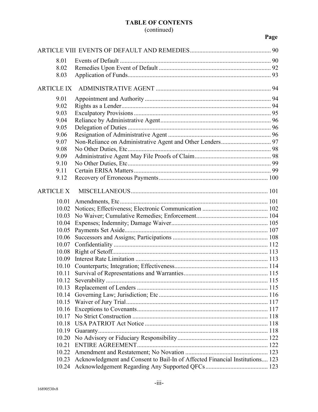 16890530v8 TABLE OF CONTENTS (continued) Page -iii- ARTICLE VIII EVENTS OF DEFAULT AND REMEDIES .................................................... 90 8.01 Events of Default ................................................................................................. 90 8.02 Remedies Upon Event of Default ........................................................................ 92 8.03 Application of Funds............................................................................................ 93 ARTICLE IX ADMINISTRATIVE AGENT .......................................................................... 94 9.01 Appointment and Authority ................................................................................. 94 9.02 Rights as a Lender ................................................................................................ 94 9.03 Exculpatory Provisions ........................................................................................ 95 9.04 Reliance by Administrative Agent ....................................................................... 96 9.05 Delegation of Duties ............................................................................................ 96 9.06 Resignation of Administrative Agent .................................................................. 96 9.07 Non-Reliance on Administrative Agent and Other Lenders ................................ 97 9.08 No Other Duties, Etc ............................................................................................ 98 9.09 Administrative Agent May File Proofs of Claim ................................................. 98 9.10 No Other Duties, Etc ............................................................................................ 99 9.11 Certain ERISA Matters ........................................................................................ 99 9.12 Recovery of Erroneous Payments ...................................................................... 100 ARTICLE X MISCELLANEOUS ........................................................................................ 101 10.01 Amendments, Etc ............................................................................................... 101 10.02 Notices; Effectiveness; Electronic Communication .......................................... 102 10.03 No Waiver; Cumulative Remedies; Enforcement.............................................. 104 10.04 Expenses; Indemnity; Damage Waiver .............................................................. 105 10.05 Payments Set Aside............................................................................................ 107 10.06 Successors and Assigns; Participations ............................................................. 108 10.07 Confidentiality ................................................................................................... 112 10.08 Right of Setoff.................................................................................................... 113 10.09 Interest Rate Limitation ..................................................................................... 113 10.10 Counterparts; Integration; Effectiveness ............................................................ 114 10.11 Survival of Representations and Warranties ...................................................... 115 10.12 Severability ........................................................................................................ 115 10.13 Replacement of Lenders .................................................................................... 115 10.14 Governing Law; Jurisdiction; Etc ...................................................................... 116 10.15 Waiver of Jury Trial ........................................................................................... 117 10.16 Exceptions to Covenants .................................................................................... 117 10.17 No Strict Construction ....................................................................................... 118 10.18 USA PATRIOT Act Notice ............................................................................... 118 10.19 Guaranty ............................................................................................................. 118 10.20 No Advisory or Fiduciary Responsibility .......................................................... 122 10.21 ENTIRE AGREEMENT .................................................................................... 122 10.22 Amendment and Restatement; No Novation ..................................................... 123 10.23 Acknowledgment and Consent to Bail-In of Affected Financial Institutions.... 123 10.24 Acknowledgement Regarding Any Supported QFCs ........................................ 123