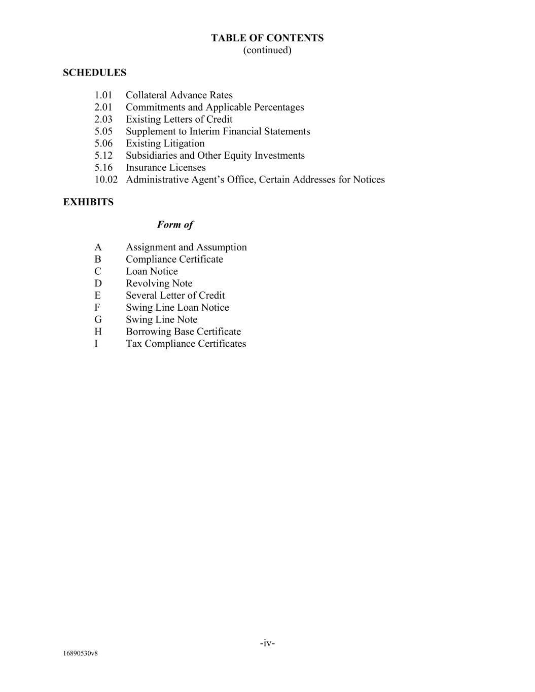 16890530v8 TABLE OF CONTENTS (continued) -iv- SCHEDULES 1.01 Collateral Advance Rates 2.01 Commitments and Applicable Percentages 2.03 Existing Letters of Credit 5.05 Supplement to Interim Financial Statements 5.06 Existing Litigation 5.12 Subsidiaries and Other Equity Investments 5.16 Insurance Licenses 10.02 Administrative Agent’s Office, Certain Addresses for Notices EXHIBITS Form of A Assignment and Assumption B Compliance Certificate C Loan Notice D Revolving Note E Several Letter of Credit F Swing Line Loan Notice G Swing Line Note H Borrowing Base Certificate I Tax Compliance Certificates