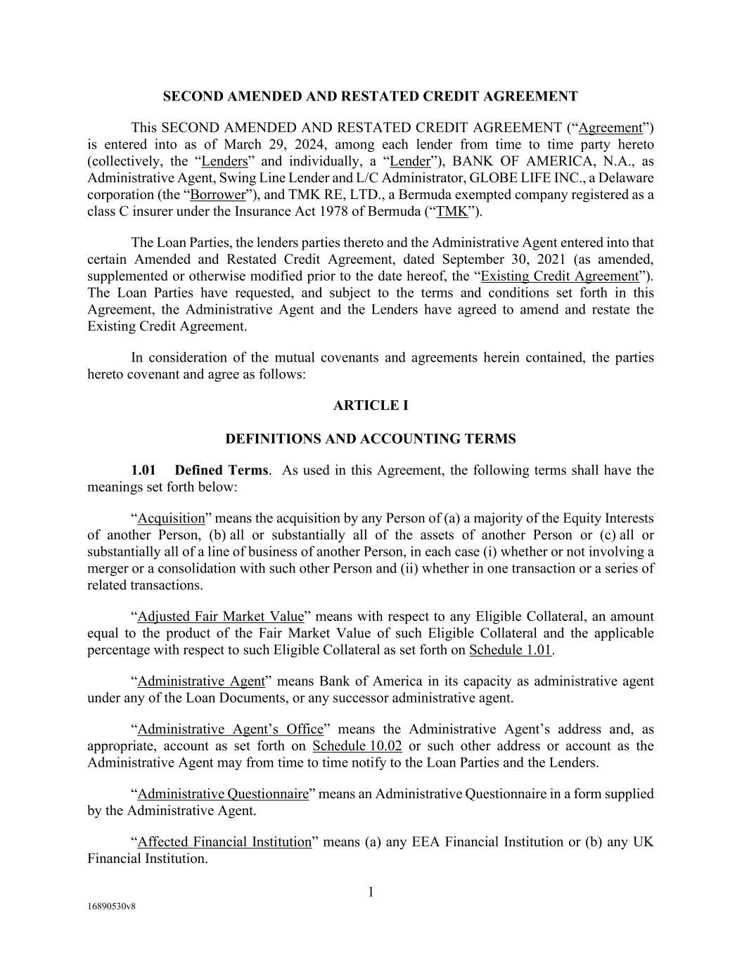 16890530v8 1 SECOND AMENDED AND RESTATED CREDIT AGREEMENT This SECOND AMENDED AND RESTATED CREDIT AGREEMENT (“Agreement”) is entered into as of March 29, 2024, among each lender from time to time party hereto (collectively, the “Lenders” and individually, a “Lender”), BANK OF AMERICA, N.A., as Administrative Agent, Swing Line Lender and L/C Administrator, GLOBE LIFE INC., a Delaware corporation (the “Borrower”), and TMK RE, LTD., a Bermuda exempted company registered as a class C insurer under the Insurance Act 1978 of Bermuda (“TMK”). The Loan Parties, the lenders parties thereto and the Administrative Agent entered into that certain Amended and Restated Credit Agreement, dated September 30, 2021 (as amended, supplemented or otherwise modified prior to the date hereof, the “Existing Credit Agreement”). The Loan Parties have requested, and subject to the terms and conditions set forth in this Agreement, the Administrative Agent and the Lenders have agreed to amend and restate the Existing Credit Agreement. In consideration of the mutual covenants and agreements herein contained, the parties hereto covenant and agree as follows: ARTICLE I DEFINITIONS AND ACCOUNTING TERMS 1.01 Defined Terms. As used in this Agreement, the following terms shall have the meanings set forth below: “Acquisition” means the acquisition by any Person of (a) a majority of the Equity Interests of another Person, (b) all or substantially all of the assets of another Person or (c) all or substantially all of a line of business of another Person, in each case (i) whether or not involving a merger or a consolidation with such other Person and (ii) whether in one transaction or a series of related transactions. “Adjusted Fair Market Value” means with respect to any Eligible Collateral, an amount equal to the product of the Fair Market Value of such Eligible Collateral and the applicable percentage with respect to such Eligible Collateral as set forth on Schedule 1.01. “Administrative Agent” means Bank of America in its capacity as administrative agent under any of the Loan Documents, or any successor administrative agent. “Administrative Agent’s Office” means the Administrative Agent’s address and, as appropriate, account as set forth on Schedule 10.02 or such other address or account as the Administrative Agent may from time to time notify to the Loan Parties and the Lenders. “Administrative Questionnaire” means an Administrative Questionnaire in a form supplied by the Administrative Agent. “Affected Financial Institution” means (a) any EEA Financial Institution or (b) any UK Financial Institution.