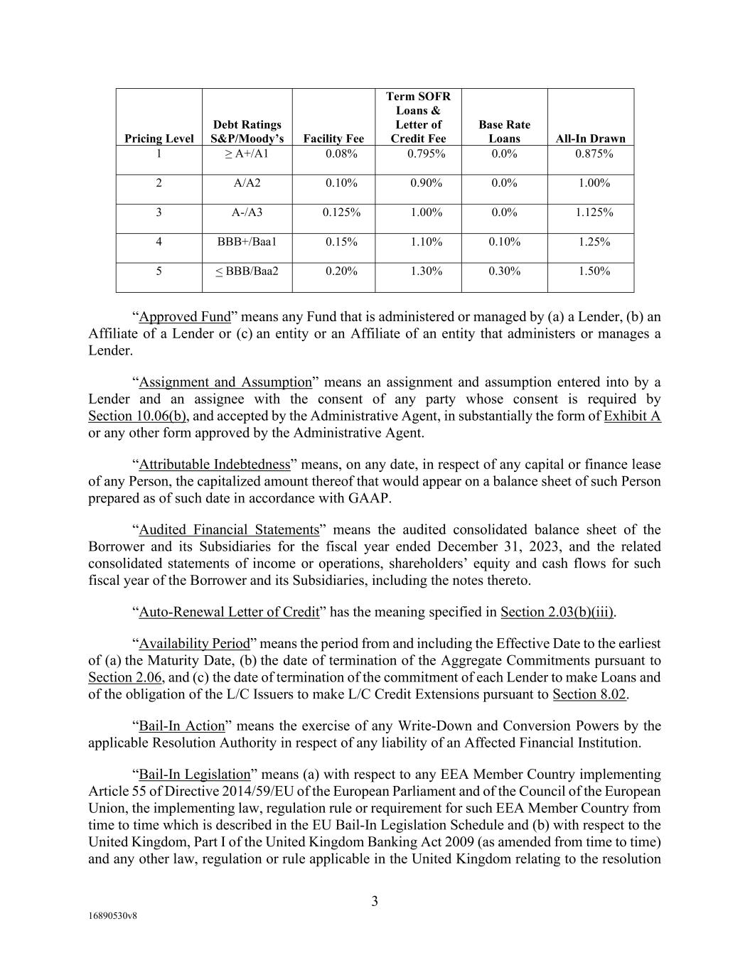 16890530v8 3 Pricing Level Debt Ratings S&P/Moody’s Facility Fee Term SOFR Loans & Letter of Credit Fee Base Rate Loans All-In Drawn 1 ≥ A+/A1 0.08% 0.795% 0.0% 0.875% 2 A/A2 0.10% 0.90% 0.0% 1.00% 3 A-/A3 0.125% 1.00% 0.0% 1.125% 4 BBB+/Baa1 0.15% 1.10% 0.10% 1.25% 5 < BBB/Baa2 0.20% 1.30% 0.30% 1.50% “Approved Fund” means any Fund that is administered or managed by (a) a Lender, (b) an Affiliate of a Lender or (c) an entity or an Affiliate of an entity that administers or manages a Lender. “Assignment and Assumption” means an assignment and assumption entered into by a Lender and an assignee with the consent of any party whose consent is required by Section 10.06(b), and accepted by the Administrative Agent, in substantially the form of Exhibit A or any other form approved by the Administrative Agent. “Attributable Indebtedness” means, on any date, in respect of any capital or finance lease of any Person, the capitalized amount thereof that would appear on a balance sheet of such Person prepared as of such date in accordance with GAAP. “Audited Financial Statements” means the audited consolidated balance sheet of the Borrower and its Subsidiaries for the fiscal year ended December 31, 2023, and the related consolidated statements of income or operations, shareholders’ equity and cash flows for such fiscal year of the Borrower and its Subsidiaries, including the notes thereto. “Auto-Renewal Letter of Credit” has the meaning specified in Section 2.03(b)(iii). “Availability Period” means the period from and including the Effective Date to the earliest of (a) the Maturity Date, (b) the date of termination of the Aggregate Commitments pursuant to Section 2.06, and (c) the date of termination of the commitment of each Lender to make Loans and of the obligation of the L/C Issuers to make L/C Credit Extensions pursuant to Section 8.02. “Bail-In Action” means the exercise of any Write-Down and Conversion Powers by the applicable Resolution Authority in respect of any liability of an Affected Financial Institution. “Bail-In Legislation” means (a) with respect to any EEA Member Country implementing Article 55 of Directive 2014/59/EU of the European Parliament and of the Council of the European Union, the implementing law, regulation rule or requirement for such EEA Member Country from time to time which is described in the EU Bail-In Legislation Schedule and (b) with respect to the United Kingdom, Part I of the United Kingdom Banking Act 2009 (as amended from time to time) and any other law, regulation or rule applicable in the United Kingdom relating to the resolution
