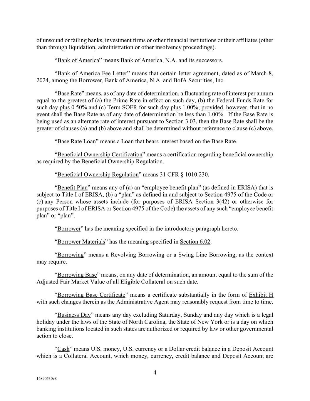 16890530v8 4 of unsound or failing banks, investment firms or other financial institutions or their affiliates (other than through liquidation, administration or other insolvency proceedings). “Bank of America” means Bank of America, N.A. and its successors. “Bank of America Fee Letter” means that certain letter agreement, dated as of March 8, 2024, among the Borrower, Bank of America, N.A. and BofA Securities, Inc. “Base Rate” means, as of any date of determination, a fluctuating rate of interest per annum equal to the greatest of (a) the Prime Rate in effect on such day, (b) the Federal Funds Rate for such day plus 0.50% and (c) Term SOFR for such day plus 1.00%; provided, however, that in no event shall the Base Rate as of any date of determination be less than 1.00%. If the Base Rate is being used as an alternate rate of interest pursuant to Section 3.03, then the Base Rate shall be the greater of clauses (a) and (b) above and shall be determined without reference to clause (c) above. “Base Rate Loan” means a Loan that bears interest based on the Base Rate. “Beneficial Ownership Certification” means a certification regarding beneficial ownership as required by the Beneficial Ownership Regulation. “Beneficial Ownership Regulation” means 31 CFR § 1010.230. “Benefit Plan” means any of (a) an “employee benefit plan” (as defined in ERISA) that is subject to Title I of ERISA, (b) a “plan” as defined in and subject to Section 4975 of the Code or (c) any Person whose assets include (for purposes of ERISA Section 3(42) or otherwise for purposes of Title I of ERISA or Section 4975 of the Code) the assets of any such “employee benefit plan” or “plan”. “Borrower” has the meaning specified in the introductory paragraph hereto. “Borrower Materials” has the meaning specified in Section 6.02. “Borrowing” means a Revolving Borrowing or a Swing Line Borrowing, as the context may require. “Borrowing Base” means, on any date of determination, an amount equal to the sum of the Adjusted Fair Market Value of all Eligible Collateral on such date. “Borrowing Base Certificate” means a certificate substantially in the form of Exhibit H with such changes therein as the Administrative Agent may reasonably request from time to time. “Business Day” means any day excluding Saturday, Sunday and any day which is a legal holiday under the laws of the State of North Carolina, the State of New York or is a day on which banking institutions located in such states are authorized or required by law or other governmental action to close. “Cash” means U.S. money, U.S. currency or a Dollar credit balance in a Deposit Account which is a Collateral Account, which money, currency, credit balance and Deposit Account are
