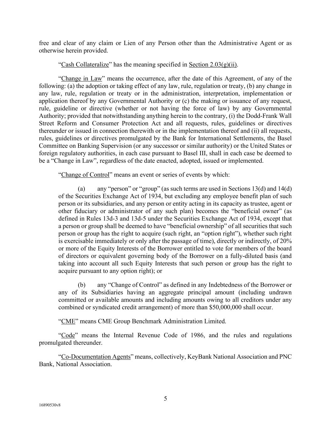 16890530v8 5 free and clear of any claim or Lien of any Person other than the Administrative Agent or as otherwise herein provided. “Cash Collateralize” has the meaning specified in Section 2.03(g)(ii). “Change in Law” means the occurrence, after the date of this Agreement, of any of the following: (a) the adoption or taking effect of any law, rule, regulation or treaty, (b) any change in any law, rule, regulation or treaty or in the administration, interpretation, implementation or application thereof by any Governmental Authority or (c) the making or issuance of any request, rule, guideline or directive (whether or not having the force of law) by any Governmental Authority; provided that notwithstanding anything herein to the contrary, (i) the Dodd-Frank Wall Street Reform and Consumer Protection Act and all requests, rules, guidelines or directives thereunder or issued in connection therewith or in the implementation thereof and (ii) all requests, rules, guidelines or directives promulgated by the Bank for International Settlements, the Basel Committee on Banking Supervision (or any successor or similar authority) or the United States or foreign regulatory authorities, in each case pursuant to Basel III, shall in each case be deemed to be a “Change in Law”, regardless of the date enacted, adopted, issued or implemented. “Change of Control” means an event or series of events by which: (a) any “person” or “group” (as such terms are used in Sections 13(d) and 14(d) of the Securities Exchange Act of 1934, but excluding any employee benefit plan of such person or its subsidiaries, and any person or entity acting in its capacity as trustee, agent or other fiduciary or administrator of any such plan) becomes the “beneficial owner” (as defined in Rules 13d-3 and 13d-5 under the Securities Exchange Act of 1934, except that a person or group shall be deemed to have “beneficial ownership” of all securities that such person or group has the right to acquire (such right, an “option right”), whether such right is exercisable immediately or only after the passage of time), directly or indirectly, of 20% or more of the Equity Interests of the Borrower entitled to vote for members of the board of directors or equivalent governing body of the Borrower on a fully-diluted basis (and taking into account all such Equity Interests that such person or group has the right to acquire pursuant to any option right); or (b) any “Change of Control” as defined in any Indebtedness of the Borrower or any of its Subsidiaries having an aggregate principal amount (including undrawn committed or available amounts and including amounts owing to all creditors under any combined or syndicated credit arrangement) of more than $50,000,000 shall occur. “CME” means CME Group Benchmark Administration Limited. “Code” means the Internal Revenue Code of 1986, and the rules and regulations promulgated thereunder. “Co-Documentation Agents” means, collectively, KeyBank National Association and PNC Bank, National Association.
