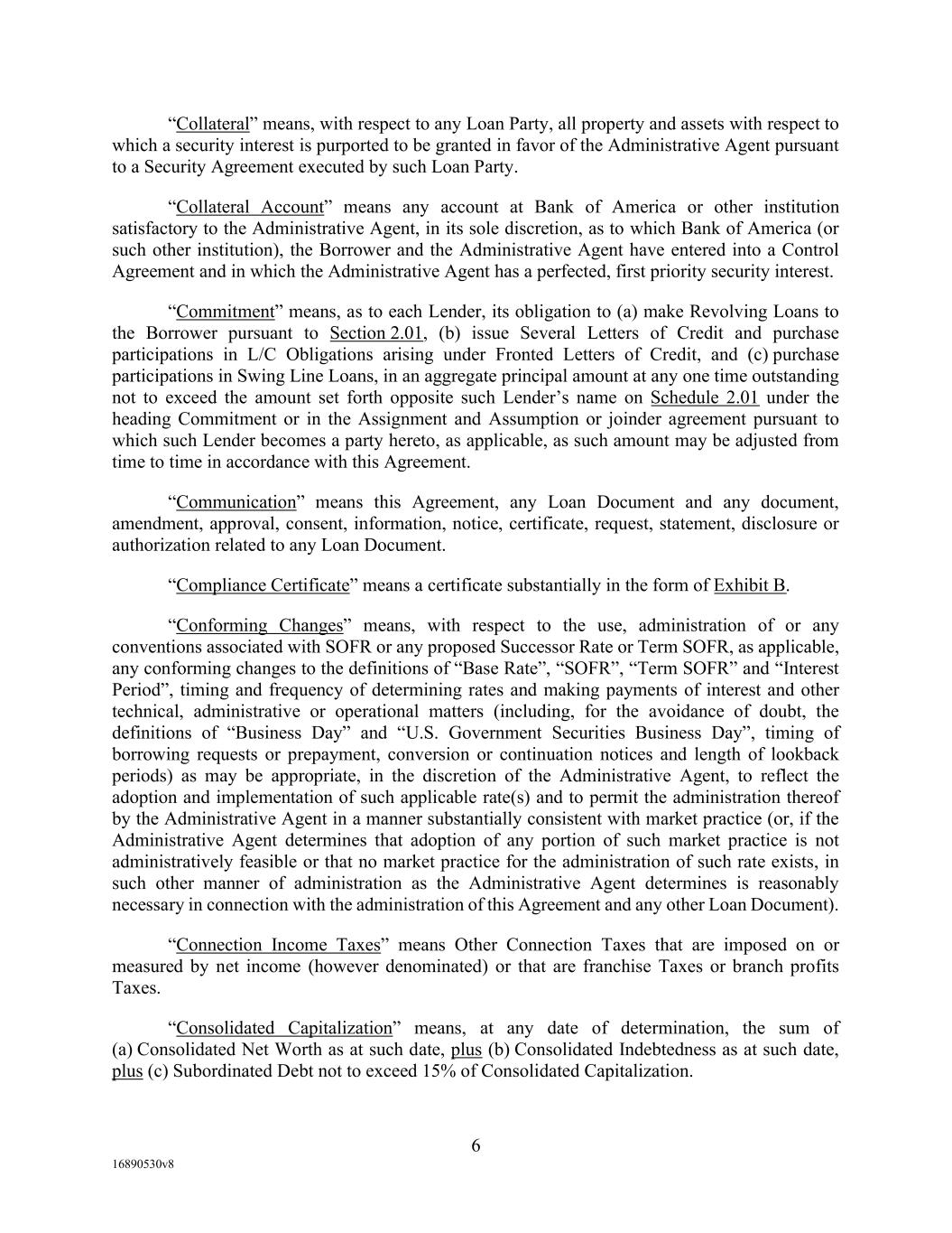 16890530v8 6 “Collateral” means, with respect to any Loan Party, all property and assets with respect to which a security interest is purported to be granted in favor of the Administrative Agent pursuant to a Security Agreement executed by such Loan Party. “Collateral Account” means any account at Bank of America or other institution satisfactory to the Administrative Agent, in its sole discretion, as to which Bank of America (or such other institution), the Borrower and the Administrative Agent have entered into a Control Agreement and in which the Administrative Agent has a perfected, first priority security interest. “Commitment” means, as to each Lender, its obligation to (a) make Revolving Loans to the Borrower pursuant to Section 2.01, (b) issue Several Letters of Credit and purchase participations in L/C Obligations arising under Fronted Letters of Credit, and (c) purchase participations in Swing Line Loans, in an aggregate principal amount at any one time outstanding not to exceed the amount set forth opposite such Lender’s name on Schedule 2.01 under the heading Commitment or in the Assignment and Assumption or joinder agreement pursuant to which such Lender becomes a party hereto, as applicable, as such amount may be adjusted from time to time in accordance with this Agreement. “Communication” means this Agreement, any Loan Document and any document, amendment, approval, consent, information, notice, certificate, request, statement, disclosure or authorization related to any Loan Document. “Compliance Certificate” means a certificate substantially in the form of Exhibit B. “Conforming Changes” means, with respect to the use, administration of or any conventions associated with SOFR or any proposed Successor Rate or Term SOFR, as applicable, any conforming changes to the definitions of “Base Rate”, “SOFR”, “Term SOFR” and “Interest Period”, timing and frequency of determining rates and making payments of interest and other technical, administrative or operational matters (including, for the avoidance of doubt, the definitions of “Business Day” and “U.S. Government Securities Business Day”, timing of borrowing requests or prepayment, conversion or continuation notices and length of lookback periods) as may be appropriate, in the discretion of the Administrative Agent, to reflect the adoption and implementation of such applicable rate(s) and to permit the administration thereof by the Administrative Agent in a manner substantially consistent with market practice (or, if the Administrative Agent determines that adoption of any portion of such market practice is not administratively feasible or that no market practice for the administration of such rate exists, in such other manner of administration as the Administrative Agent determines is reasonably necessary in connection with the administration of this Agreement and any other Loan Document). “Connection Income Taxes” means Other Connection Taxes that are imposed on or measured by net income (however denominated) or that are franchise Taxes or branch profits Taxes. “Consolidated Capitalization” means, at any date of determination, the sum of (a) Consolidated Net Worth as at such date, plus (b) Consolidated Indebtedness as at such date, plus (c) Subordinated Debt not to exceed 15% of Consolidated Capitalization.
