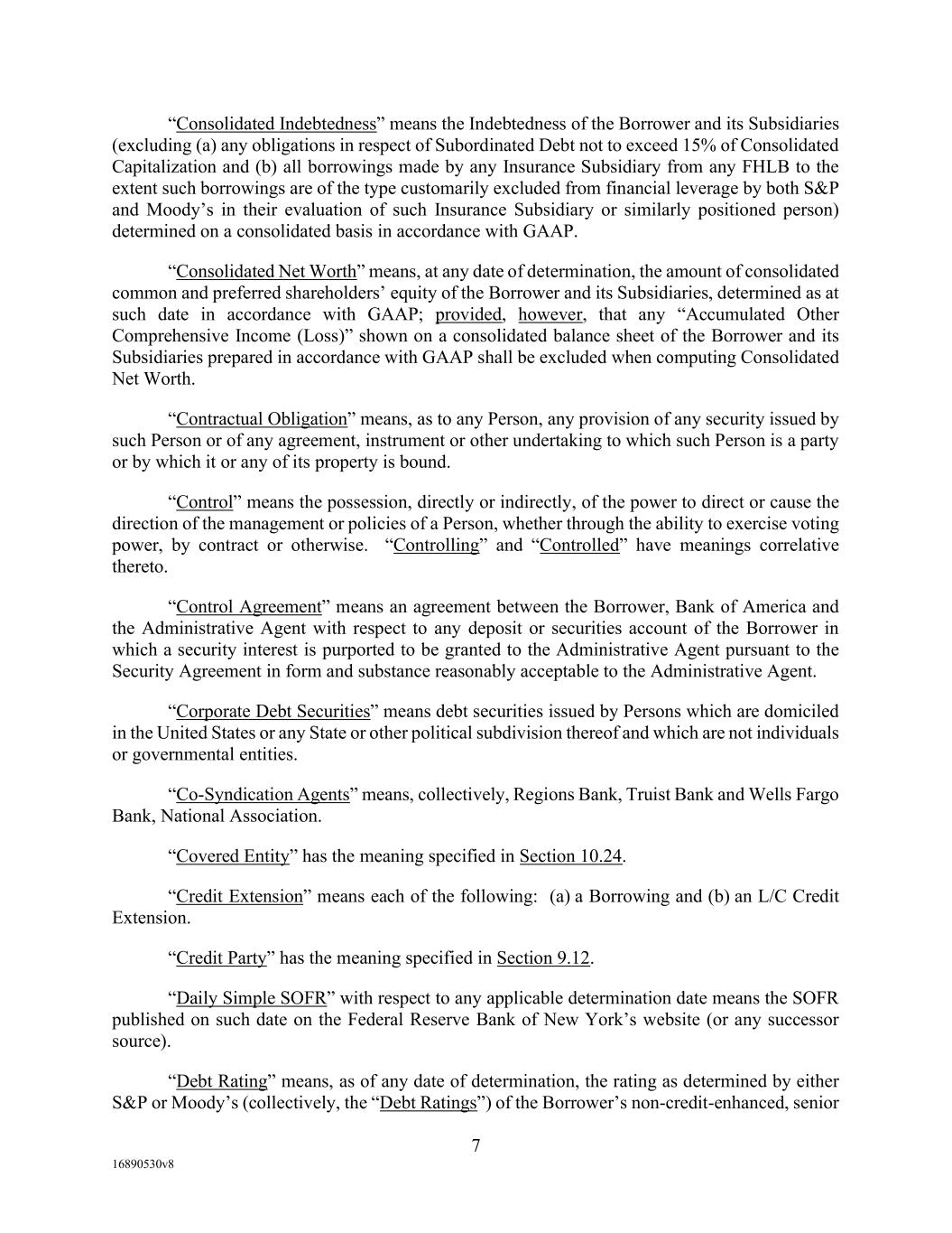 16890530v8 7 “Consolidated Indebtedness” means the Indebtedness of the Borrower and its Subsidiaries (excluding (a) any obligations in respect of Subordinated Debt not to exceed 15% of Consolidated Capitalization and (b) all borrowings made by any Insurance Subsidiary from any FHLB to the extent such borrowings are of the type customarily excluded from financial leverage by both S&P and Moody’s in their evaluation of such Insurance Subsidiary or similarly positioned person) determined on a consolidated basis in accordance with GAAP. “Consolidated Net Worth” means, at any date of determination, the amount of consolidated common and preferred shareholders’ equity of the Borrower and its Subsidiaries, determined as at such date in accordance with GAAP; provided, however, that any “Accumulated Other Comprehensive Income (Loss)” shown on a consolidated balance sheet of the Borrower and its Subsidiaries prepared in accordance with GAAP shall be excluded when computing Consolidated Net Worth. “Contractual Obligation” means, as to any Person, any provision of any security issued by such Person or of any agreement, instrument or other undertaking to which such Person is a party or by which it or any of its property is bound. “Control” means the possession, directly or indirectly, of the power to direct or cause the direction of the management or policies of a Person, whether through the ability to exercise voting power, by contract or otherwise. “Controlling” and “Controlled” have meanings correlative thereto. “Control Agreement” means an agreement between the Borrower, Bank of America and the Administrative Agent with respect to any deposit or securities account of the Borrower in which a security interest is purported to be granted to the Administrative Agent pursuant to the Security Agreement in form and substance reasonably acceptable to the Administrative Agent. “Corporate Debt Securities” means debt securities issued by Persons which are domiciled in the United States or any State or other political subdivision thereof and which are not individuals or governmental entities. “Co-Syndication Agents” means, collectively, Regions Bank, Truist Bank and Wells Fargo Bank, National Association. “Covered Entity” has the meaning specified in Section 10.24. “Credit Extension” means each of the following: (a) a Borrowing and (b) an L/C Credit Extension. “Credit Party” has the meaning specified in Section 9.12. “Daily Simple SOFR” with respect to any applicable determination date means the SOFR published on such date on the Federal Reserve Bank of New York’s website (or any successor source). “Debt Rating” means, as of any date of determination, the rating as determined by either S&P or Moody’s (collectively, the “Debt Ratings”) of the Borrower’s non-credit-enhanced, senior