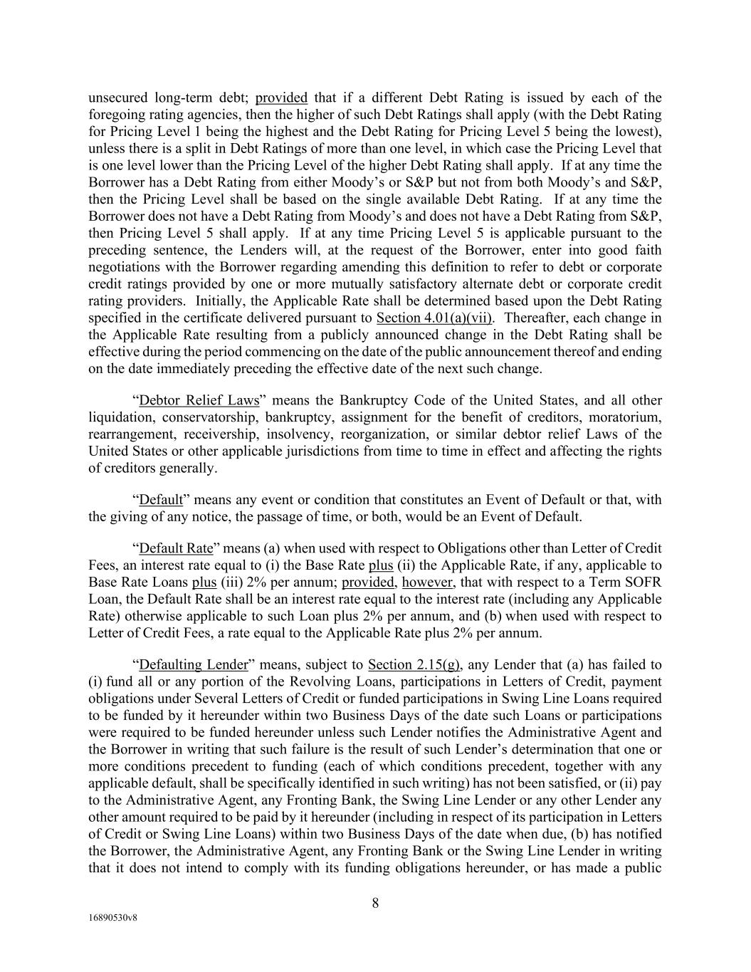 16890530v8 8 unsecured long-term debt; provided that if a different Debt Rating is issued by each of the foregoing rating agencies, then the higher of such Debt Ratings shall apply (with the Debt Rating for Pricing Level 1 being the highest and the Debt Rating for Pricing Level 5 being the lowest), unless there is a split in Debt Ratings of more than one level, in which case the Pricing Level that is one level lower than the Pricing Level of the higher Debt Rating shall apply. If at any time the Borrower has a Debt Rating from either Moody’s or S&P but not from both Moody’s and S&P, then the Pricing Level shall be based on the single available Debt Rating. If at any time the Borrower does not have a Debt Rating from Moody’s and does not have a Debt Rating from S&P, then Pricing Level 5 shall apply. If at any time Pricing Level 5 is applicable pursuant to the preceding sentence, the Lenders will, at the request of the Borrower, enter into good faith negotiations with the Borrower regarding amending this definition to refer to debt or corporate credit ratings provided by one or more mutually satisfactory alternate debt or corporate credit rating providers. Initially, the Applicable Rate shall be determined based upon the Debt Rating specified in the certificate delivered pursuant to Section 4.01(a)(vii). Thereafter, each change in the Applicable Rate resulting from a publicly announced change in the Debt Rating shall be effective during the period commencing on the date of the public announcement thereof and ending on the date immediately preceding the effective date of the next such change. “Debtor Relief Laws” means the Bankruptcy Code of the United States, and all other liquidation, conservatorship, bankruptcy, assignment for the benefit of creditors, moratorium, rearrangement, receivership, insolvency, reorganization, or similar debtor relief Laws of the United States or other applicable jurisdictions from time to time in effect and affecting the rights of creditors generally. “Default” means any event or condition that constitutes an Event of Default or that, with the giving of any notice, the passage of time, or both, would be an Event of Default. “Default Rate” means (a) when used with respect to Obligations other than Letter of Credit Fees, an interest rate equal to (i) the Base Rate plus (ii) the Applicable Rate, if any, applicable to Base Rate Loans plus (iii) 2% per annum; provided, however, that with respect to a Term SOFR Loan, the Default Rate shall be an interest rate equal to the interest rate (including any Applicable Rate) otherwise applicable to such Loan plus 2% per annum, and (b) when used with respect to Letter of Credit Fees, a rate equal to the Applicable Rate plus 2% per annum. “Defaulting Lender” means, subject to Section 2.15(g), any Lender that (a) has failed to (i) fund all or any portion of the Revolving Loans, participations in Letters of Credit, payment obligations under Several Letters of Credit or funded participations in Swing Line Loans required to be funded by it hereunder within two Business Days of the date such Loans or participations were required to be funded hereunder unless such Lender notifies the Administrative Agent and the Borrower in writing that such failure is the result of such Lender’s determination that one or more conditions precedent to funding (each of which conditions precedent, together with any applicable default, shall be specifically identified in such writing) has not been satisfied, or (ii) pay to the Administrative Agent, any Fronting Bank, the Swing Line Lender or any other Lender any other amount required to be paid by it hereunder (including in respect of its participation in Letters of Credit or Swing Line Loans) within two Business Days of the date when due, (b) has notified the Borrower, the Administrative Agent, any Fronting Bank or the Swing Line Lender in writing that it does not intend to comply with its funding obligations hereunder, or has made a public