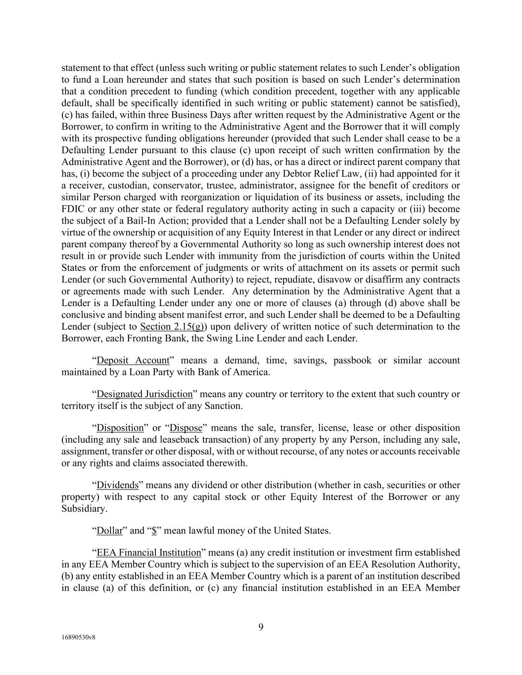 16890530v8 9 statement to that effect (unless such writing or public statement relates to such Lender’s obligation to fund a Loan hereunder and states that such position is based on such Lender’s determination that a condition precedent to funding (which condition precedent, together with any applicable default, shall be specifically identified in such writing or public statement) cannot be satisfied), (c) has failed, within three Business Days after written request by the Administrative Agent or the Borrower, to confirm in writing to the Administrative Agent and the Borrower that it will comply with its prospective funding obligations hereunder (provided that such Lender shall cease to be a Defaulting Lender pursuant to this clause (c) upon receipt of such written confirmation by the Administrative Agent and the Borrower), or (d) has, or has a direct or indirect parent company that has, (i) become the subject of a proceeding under any Debtor Relief Law, (ii) had appointed for it a receiver, custodian, conservator, trustee, administrator, assignee for the benefit of creditors or similar Person charged with reorganization or liquidation of its business or assets, including the FDIC or any other state or federal regulatory authority acting in such a capacity or (iii) become the subject of a Bail-In Action; provided that a Lender shall not be a Defaulting Lender solely by virtue of the ownership or acquisition of any Equity Interest in that Lender or any direct or indirect parent company thereof by a Governmental Authority so long as such ownership interest does not result in or provide such Lender with immunity from the jurisdiction of courts within the United States or from the enforcement of judgments or writs of attachment on its assets or permit such Lender (or such Governmental Authority) to reject, repudiate, disavow or disaffirm any contracts or agreements made with such Lender. Any determination by the Administrative Agent that a Lender is a Defaulting Lender under any one or more of clauses (a) through (d) above shall be conclusive and binding absent manifest error, and such Lender shall be deemed to be a Defaulting Lender (subject to Section 2.15(g)) upon delivery of written notice of such determination to the Borrower, each Fronting Bank, the Swing Line Lender and each Lender. “Deposit Account” means a demand, time, savings, passbook or similar account maintained by a Loan Party with Bank of America. “Designated Jurisdiction” means any country or territory to the extent that such country or territory itself is the subject of any Sanction. “Disposition” or “Dispose” means the sale, transfer, license, lease or other disposition (including any sale and leaseback transaction) of any property by any Person, including any sale, assignment, transfer or other disposal, with or without recourse, of any notes or accounts receivable or any rights and claims associated therewith. “Dividends” means any dividend or other distribution (whether in cash, securities or other property) with respect to any capital stock or other Equity Interest of the Borrower or any Subsidiary. “Dollar” and “$” mean lawful money of the United States. “EEA Financial Institution” means (a) any credit institution or investment firm established in any EEA Member Country which is subject to the supervision of an EEA Resolution Authority, (b) any entity established in an EEA Member Country which is a parent of an institution described in clause (a) of this definition, or (c) any financial institution established in an EEA Member