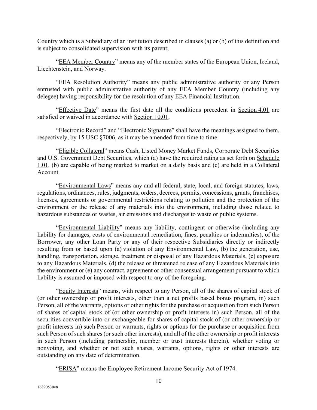 16890530v8 10 Country which is a Subsidiary of an institution described in clauses (a) or (b) of this definition and is subject to consolidated supervision with its parent; “EEA Member Country” means any of the member states of the European Union, Iceland, Liechtenstein, and Norway. “EEA Resolution Authority” means any public administrative authority or any Person entrusted with public administrative authority of any EEA Member Country (including any delegee) having responsibility for the resolution of any EEA Financial Institution. “Effective Date” means the first date all the conditions precedent in Section 4.01 are satisfied or waived in accordance with Section 10.01. “Electronic Record” and “Electronic Signature” shall have the meanings assigned to them, respectively, by 15 USC §7006, as it may be amended from time to time. “Eligible Collateral” means Cash, Listed Money Market Funds, Corporate Debt Securities and U.S. Government Debt Securities, which (a) have the required rating as set forth on Schedule 1.01, (b) are capable of being marked to market on a daily basis and (c) are held in a Collateral Account. “Environmental Laws” means any and all federal, state, local, and foreign statutes, laws, regulations, ordinances, rules, judgments, orders, decrees, permits, concessions, grants, franchises, licenses, agreements or governmental restrictions relating to pollution and the protection of the environment or the release of any materials into the environment, including those related to hazardous substances or wastes, air emissions and discharges to waste or public systems. “Environmental Liability” means any liability, contingent or otherwise (including any liability for damages, costs of environmental remediation, fines, penalties or indemnities), of the Borrower, any other Loan Party or any of their respective Subsidiaries directly or indirectly resulting from or based upon (a) violation of any Environmental Law, (b) the generation, use, handling, transportation, storage, treatment or disposal of any Hazardous Materials, (c) exposure to any Hazardous Materials, (d) the release or threatened release of any Hazardous Materials into the environment or (e) any contract, agreement or other consensual arrangement pursuant to which liability is assumed or imposed with respect to any of the foregoing. “Equity Interests” means, with respect to any Person, all of the shares of capital stock of (or other ownership or profit interests, other than a net profits based bonus program, in) such Person, all of the warrants, options or other rights for the purchase or acquisition from such Person of shares of capital stock of (or other ownership or profit interests in) such Person, all of the securities convertible into or exchangeable for shares of capital stock of (or other ownership or profit interests in) such Person or warrants, rights or options for the purchase or acquisition from such Person of such shares (or such other interests), and all of the other ownership or profit interests in such Person (including partnership, member or trust interests therein), whether voting or nonvoting, and whether or not such shares, warrants, options, rights or other interests are outstanding on any date of determination. “ERISA” means the Employee Retirement Income Security Act of 1974.