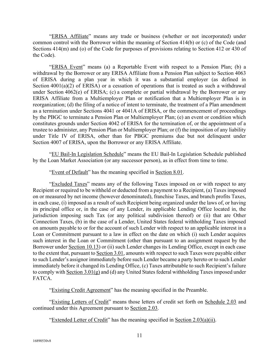 16890530v8 11 “ERISA Affiliate” means any trade or business (whether or not incorporated) under common control with the Borrower within the meaning of Section 414(b) or (c) of the Code (and Sections 414(m) and (o) of the Code for purposes of provisions relating to Section 412 or 430 of the Code). “ERISA Event” means (a) a Reportable Event with respect to a Pension Plan; (b) a withdrawal by the Borrower or any ERISA Affiliate from a Pension Plan subject to Section 4063 of ERISA during a plan year in which it was a substantial employer (as defined in Section 4001(a)(2) of ERISA) or a cessation of operations that is treated as such a withdrawal under Section 4062(e) of ERISA; (c) a complete or partial withdrawal by the Borrower or any ERISA Affiliate from a Multiemployer Plan or notification that a Multiemployer Plan is in reorganization; (d) the filing of a notice of intent to terminate, the treatment of a Plan amendment as a termination under Sections 4041 or 4041A of ERISA, or the commencement of proceedings by the PBGC to terminate a Pension Plan or Multiemployer Plan; (e) an event or condition which constitutes grounds under Section 4042 of ERISA for the termination of, or the appointment of a trustee to administer, any Pension Plan or Multiemployer Plan; or (f) the imposition of any liability under Title IV of ERISA, other than for PBGC premiums due but not delinquent under Section 4007 of ERISA, upon the Borrower or any ERISA Affiliate. “EU Bail-In Legislation Schedule” means the EU Bail-In Legislation Schedule published by the Loan Market Association (or any successor person), as in effect from time to time. “Event of Default” has the meaning specified in Section 8.01. “Excluded Taxes” means any of the following Taxes imposed on or with respect to any Recipient or required to be withheld or deducted from a payment to a Recipient, (a) Taxes imposed on or measured by net income (however denominated), franchise Taxes, and branch profits Taxes, in each case, (i) imposed as a result of such Recipient being organized under the laws of, or having its principal office or, in the case of any Lender, its applicable Lending Office located in, the jurisdiction imposing such Tax (or any political subdivision thereof) or (ii) that are Other Connection Taxes, (b) in the case of a Lender, United States federal withholding Taxes imposed on amounts payable to or for the account of such Lender with respect to an applicable interest in a Loan or Commitment pursuant to a law in effect on the date on which (i) such Lender acquires such interest in the Loan or Commitment (other than pursuant to an assignment request by the Borrower under Section 10.13) or (ii) such Lender changes its Lending Office, except in each case to the extent that, pursuant to Section 3.01, amounts with respect to such Taxes were payable either to such Lender’s assignor immediately before such Lender became a party hereto or to such Lender immediately before it changed its Lending Office, (c) Taxes attributable to such Recipient’s failure to comply with Section 3.01(g) and (d) any United States federal withholding Taxes imposed under FATCA. “Existing Credit Agreement” has the meaning specified in the Preamble. “Existing Letters of Credit” means those letters of credit set forth on Schedule 2.03 and continued under this Agreement pursuant to Section 2.03. “Extended Letter of Credit” has the meaning specified in Section 2.03(a)(ii).