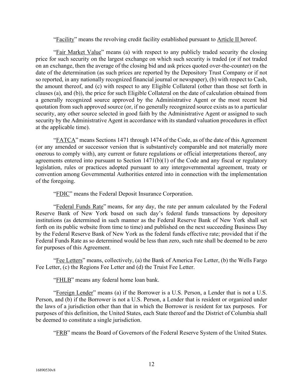 16890530v8 12 “Facility” means the revolving credit facility established pursuant to Article II hereof. “Fair Market Value” means (a) with respect to any publicly traded security the closing price for such security on the largest exchange on which such security is traded (or if not traded on an exchange, then the average of the closing bid and ask prices quoted over-the-counter) on the date of the determination (as such prices are reported by the Depository Trust Company or if not so reported, in any nationally recognized financial journal or newspaper), (b) with respect to Cash, the amount thereof, and (c) with respect to any Eligible Collateral (other than those set forth in clauses (a), and (b)), the price for such Eligible Collateral on the date of calculation obtained from a generally recognized source approved by the Administrative Agent or the most recent bid quotation from such approved source (or, if no generally recognized source exists as to a particular security, any other source selected in good faith by the Administrative Agent or assigned to such security by the Administrative Agent in accordance with its standard valuation procedures in effect at the applicable time). “FATCA” means Sections 1471 through 1474 of the Code, as of the date of this Agreement (or any amended or successor version that is substantively comparable and not materially more onerous to comply with), any current or future regulations or official interpretations thereof, any agreements entered into pursuant to Section 1471(b)(1) of the Code and any fiscal or regulatory legislation, rules or practices adopted pursuant to any intergovernmental agreement, treaty or convention among Governmental Authorities entered into in connection with the implementation of the foregoing. “FDIC” means the Federal Deposit Insurance Corporation. “Federal Funds Rate” means, for any day, the rate per annum calculated by the Federal Reserve Bank of New York based on such day’s federal funds transactions by depository institutions (as determined in such manner as the Federal Reserve Bank of New York shall set forth on its public website from time to time) and published on the next succeeding Business Day by the Federal Reserve Bank of New York as the federal funds effective rate; provided that if the Federal Funds Rate as so determined would be less than zero, such rate shall be deemed to be zero for purposes of this Agreement. “Fee Letters” means, collectively, (a) the Bank of America Fee Letter, (b) the Wells Fargo Fee Letter, (c) the Regions Fee Letter and (d) the Truist Fee Letter. “FHLB” means any federal home loan bank. “Foreign Lender” means (a) if the Borrower is a U.S. Person, a Lender that is not a U.S. Person, and (b) if the Borrower is not a U.S. Person, a Lender that is resident or organized under the laws of a jurisdiction other than that in which the Borrower is resident for tax purposes. For purposes of this definition, the United States, each State thereof and the District of Columbia shall be deemed to constitute a single jurisdiction. “FRB” means the Board of Governors of the Federal Reserve System of the United States.