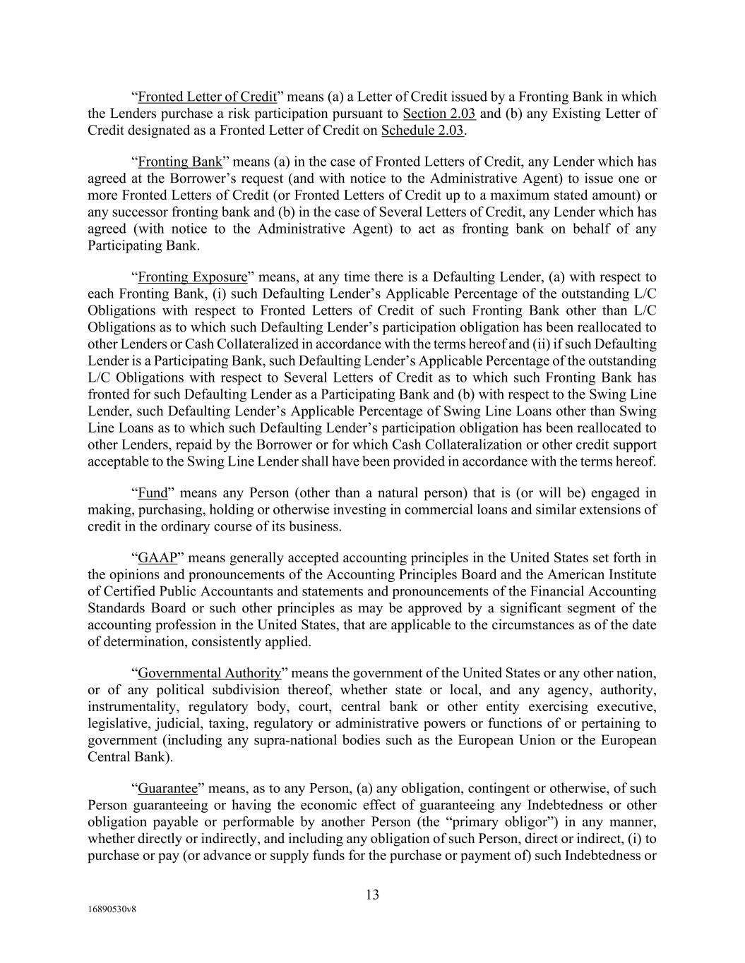 16890530v8 13 “Fronted Letter of Credit” means (a) a Letter of Credit issued by a Fronting Bank in which the Lenders purchase a risk participation pursuant to Section 2.03 and (b) any Existing Letter of Credit designated as a Fronted Letter of Credit on Schedule 2.03. “Fronting Bank” means (a) in the case of Fronted Letters of Credit, any Lender which has agreed at the Borrower’s request (and with notice to the Administrative Agent) to issue one or more Fronted Letters of Credit (or Fronted Letters of Credit up to a maximum stated amount) or any successor fronting bank and (b) in the case of Several Letters of Credit, any Lender which has agreed (with notice to the Administrative Agent) to act as fronting bank on behalf of any Participating Bank. “Fronting Exposure” means, at any time there is a Defaulting Lender, (a) with respect to each Fronting Bank, (i) such Defaulting Lender’s Applicable Percentage of the outstanding L/C Obligations with respect to Fronted Letters of Credit of such Fronting Bank other than L/C Obligations as to which such Defaulting Lender’s participation obligation has been reallocated to other Lenders or Cash Collateralized in accordance with the terms hereof and (ii) if such Defaulting Lender is a Participating Bank, such Defaulting Lender’s Applicable Percentage of the outstanding L/C Obligations with respect to Several Letters of Credit as to which such Fronting Bank has fronted for such Defaulting Lender as a Participating Bank and (b) with respect to the Swing Line Lender, such Defaulting Lender’s Applicable Percentage of Swing Line Loans other than Swing Line Loans as to which such Defaulting Lender’s participation obligation has been reallocated to other Lenders, repaid by the Borrower or for which Cash Collateralization or other credit support acceptable to the Swing Line Lender shall have been provided in accordance with the terms hereof. “Fund” means any Person (other than a natural person) that is (or will be) engaged in making, purchasing, holding or otherwise investing in commercial loans and similar extensions of credit in the ordinary course of its business. “GAAP” means generally accepted accounting principles in the United States set forth in the opinions and pronouncements of the Accounting Principles Board and the American Institute of Certified Public Accountants and statements and pronouncements of the Financial Accounting Standards Board or such other principles as may be approved by a significant segment of the accounting profession in the United States, that are applicable to the circumstances as of the date of determination, consistently applied. “Governmental Authority” means the government of the United States or any other nation, or of any political subdivision thereof, whether state or local, and any agency, authority, instrumentality, regulatory body, court, central bank or other entity exercising executive, legislative, judicial, taxing, regulatory or administrative powers or functions of or pertaining to government (including any supra-national bodies such as the European Union or the European Central Bank). “Guarantee” means, as to any Person, (a) any obligation, contingent or otherwise, of such Person guaranteeing or having the economic effect of guaranteeing any Indebtedness or other obligation payable or performable by another Person (the “primary obligor”) in any manner, whether directly or indirectly, and including any obligation of such Person, direct or indirect, (i) to purchase or pay (or advance or supply funds for the purchase or payment of) such Indebtedness or