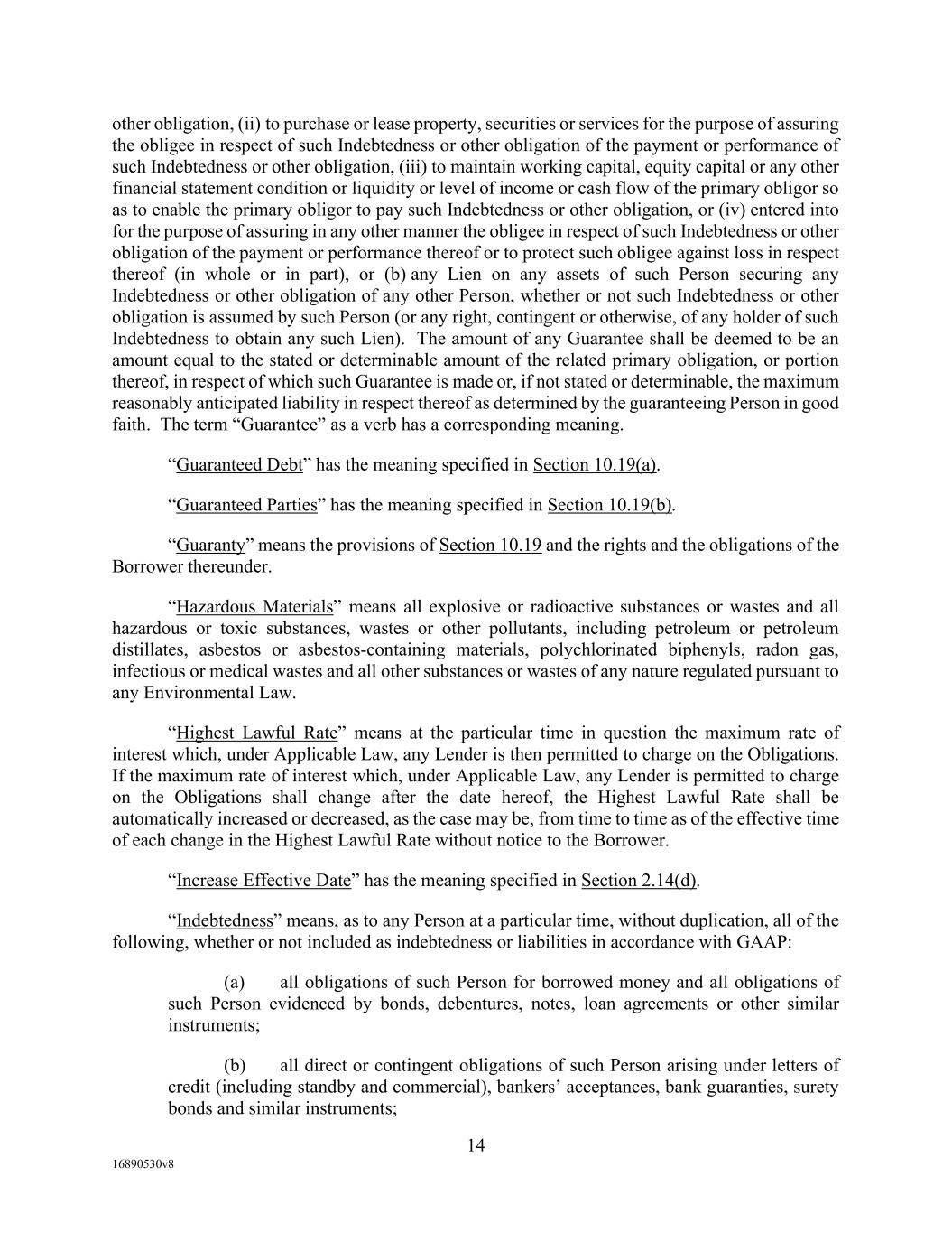 16890530v8 14 other obligation, (ii) to purchase or lease property, securities or services for the purpose of assuring the obligee in respect of such Indebtedness or other obligation of the payment or performance of such Indebtedness or other obligation, (iii) to maintain working capital, equity capital or any other financial statement condition or liquidity or level of income or cash flow of the primary obligor so as to enable the primary obligor to pay such Indebtedness or other obligation, or (iv) entered into for the purpose of assuring in any other manner the obligee in respect of such Indebtedness or other obligation of the payment or performance thereof or to protect such obligee against loss in respect thereof (in whole or in part), or (b) any Lien on any assets of such Person securing any Indebtedness or other obligation of any other Person, whether or not such Indebtedness or other obligation is assumed by such Person (or any right, contingent or otherwise, of any holder of such Indebtedness to obtain any such Lien). The amount of any Guarantee shall be deemed to be an amount equal to the stated or determinable amount of the related primary obligation, or portion thereof, in respect of which such Guarantee is made or, if not stated or determinable, the maximum reasonably anticipated liability in respect thereof as determined by the guaranteeing Person in good faith. The term “Guarantee” as a verb has a corresponding meaning. “Guaranteed Debt” has the meaning specified in Section 10.19(a). “Guaranteed Parties” has the meaning specified in Section 10.19(b). “Guaranty” means the provisions of Section 10.19 and the rights and the obligations of the Borrower thereunder. “Hazardous Materials” means all explosive or radioactive substances or wastes and all hazardous or toxic substances, wastes or other pollutants, including petroleum or petroleum distillates, asbestos or asbestos-containing materials, polychlorinated biphenyls, radon gas, infectious or medical wastes and all other substances or wastes of any nature regulated pursuant to any Environmental Law. “Highest Lawful Rate” means at the particular time in question the maximum rate of interest which, under Applicable Law, any Lender is then permitted to charge on the Obligations. If the maximum rate of interest which, under Applicable Law, any Lender is permitted to charge on the Obligations shall change after the date hereof, the Highest Lawful Rate shall be automatically increased or decreased, as the case may be, from time to time as of the effective time of each change in the Highest Lawful Rate without notice to the Borrower. “Increase Effective Date” has the meaning specified in Section 2.14(d). “Indebtedness” means, as to any Person at a particular time, without duplication, all of the following, whether or not included as indebtedness or liabilities in accordance with GAAP: (a) all obligations of such Person for borrowed money and all obligations of such Person evidenced by bonds, debentures, notes, loan agreements or other similar instruments; (b) all direct or contingent obligations of such Person arising under letters of credit (including standby and commercial), bankers’ acceptances, bank guaranties, surety bonds and similar instruments;