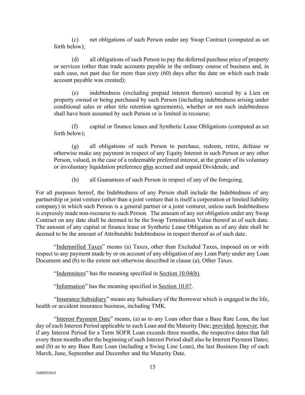16890530v8 15 (c) net obligations of such Person under any Swap Contract (computed as set forth below); (d) all obligations of such Person to pay the deferred purchase price of property or services (other than trade accounts payable in the ordinary course of business and, in each case, not past due for more than sixty (60) days after the date on which such trade account payable was created); (e) indebtedness (excluding prepaid interest thereon) secured by a Lien on property owned or being purchased by such Person (including indebtedness arising under conditional sales or other title retention agreements), whether or not such indebtedness shall have been assumed by such Person or is limited in recourse; (f) capital or finance leases and Synthetic Lease Obligations (computed as set forth below); (g) all obligations of such Person to purchase, redeem, retire, defease or otherwise make any payment in respect of any Equity Interest in such Person or any other Person, valued, in the case of a redeemable preferred interest, at the greater of its voluntary or involuntary liquidation preference plus accrued and unpaid Dividends; and (h) all Guarantees of such Person in respect of any of the foregoing. For all purposes hereof, the Indebtedness of any Person shall include the Indebtedness of any partnership or joint venture (other than a joint venture that is itself a corporation or limited liability company) in which such Person is a general partner or a joint venturer, unless such Indebtedness is expressly made non-recourse to such Person. The amount of any net obligation under any Swap Contract on any date shall be deemed to be the Swap Termination Value thereof as of such date. The amount of any capital or finance lease or Synthetic Lease Obligation as of any date shall be deemed to be the amount of Attributable Indebtedness in respect thereof as of such date. “Indemnified Taxes” means (a) Taxes, other than Excluded Taxes, imposed on or with respect to any payment made by or on account of any obligation of any Loan Party under any Loan Document and (b) to the extent not otherwise described in clause (a), Other Taxes. “Indemnitees” has the meaning specified in Section 10.04(b). “Information” has the meaning specified in Section 10.07. “Insurance Subsidiary” means any Subsidiary of the Borrower which is engaged in the life, health or accident insurance business, including TMK. “Interest Payment Date” means, (a) as to any Loan other than a Base Rate Loan, the last day of each Interest Period applicable to such Loan and the Maturity Date; provided, however, that if any Interest Period for a Term SOFR Loan exceeds three months, the respective dates that fall every three months after the beginning of such Interest Period shall also be Interest Payment Dates; and (b) as to any Base Rate Loan (including a Swing Line Loan), the last Business Day of each March, June, September and December and the Maturity Date.