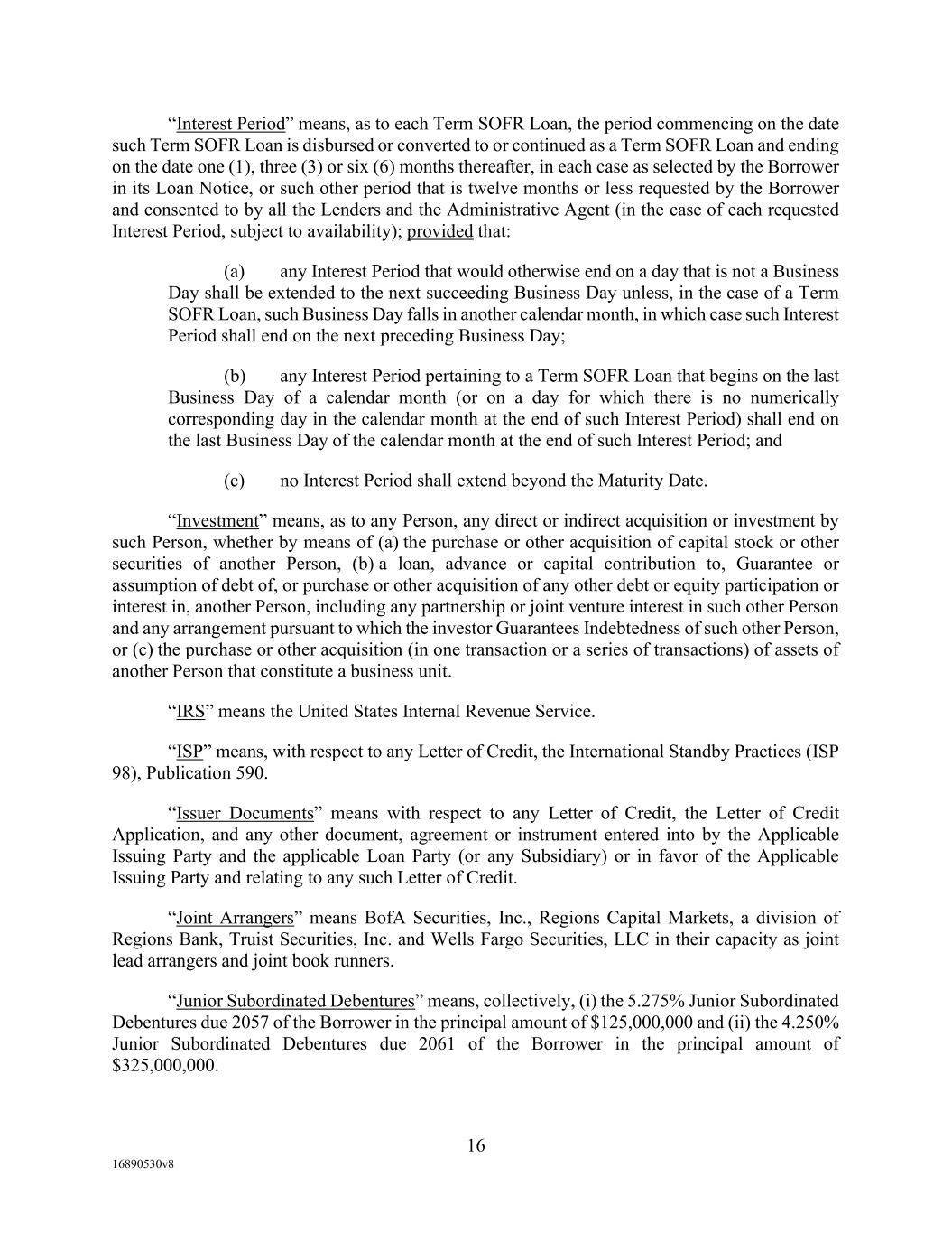 16890530v8 16 “Interest Period” means, as to each Term SOFR Loan, the period commencing on the date such Term SOFR Loan is disbursed or converted to or continued as a Term SOFR Loan and ending on the date one (1), three (3) or six (6) months thereafter, in each case as selected by the Borrower in its Loan Notice, or such other period that is twelve months or less requested by the Borrower and consented to by all the Lenders and the Administrative Agent (in the case of each requested Interest Period, subject to availability); provided that: (a) any Interest Period that would otherwise end on a day that is not a Business Day shall be extended to the next succeeding Business Day unless, in the case of a Term SOFR Loan, such Business Day falls in another calendar month, in which case such Interest Period shall end on the next preceding Business Day; (b) any Interest Period pertaining to a Term SOFR Loan that begins on the last Business Day of a calendar month (or on a day for which there is no numerically corresponding day in the calendar month at the end of such Interest Period) shall end on the last Business Day of the calendar month at the end of such Interest Period; and (c) no Interest Period shall extend beyond the Maturity Date. “Investment” means, as to any Person, any direct or indirect acquisition or investment by such Person, whether by means of (a) the purchase or other acquisition of capital stock or other securities of another Person, (b) a loan, advance or capital contribution to, Guarantee or assumption of debt of, or purchase or other acquisition of any other debt or equity participation or interest in, another Person, including any partnership or joint venture interest in such other Person and any arrangement pursuant to which the investor Guarantees Indebtedness of such other Person, or (c) the purchase or other acquisition (in one transaction or a series of transactions) of assets of another Person that constitute a business unit. “IRS” means the United States Internal Revenue Service. “ISP” means, with respect to any Letter of Credit, the International Standby Practices (ISP 98), Publication 590. “Issuer Documents” means with respect to any Letter of Credit, the Letter of Credit Application, and any other document, agreement or instrument entered into by the Applicable Issuing Party and the applicable Loan Party (or any Subsidiary) or in favor of the Applicable Issuing Party and relating to any such Letter of Credit. “Joint Arrangers” means BofA Securities, Inc., Regions Capital Markets, a division of Regions Bank, Truist Securities, Inc. and Wells Fargo Securities, LLC in their capacity as joint lead arrangers and joint book runners. “Junior Subordinated Debentures” means, collectively, (i) the 5.275% Junior Subordinated Debentures due 2057 of the Borrower in the principal amount of $125,000,000 and (ii) the 4.250% Junior Subordinated Debentures due 2061 of the Borrower in the principal amount of $325,000,000.