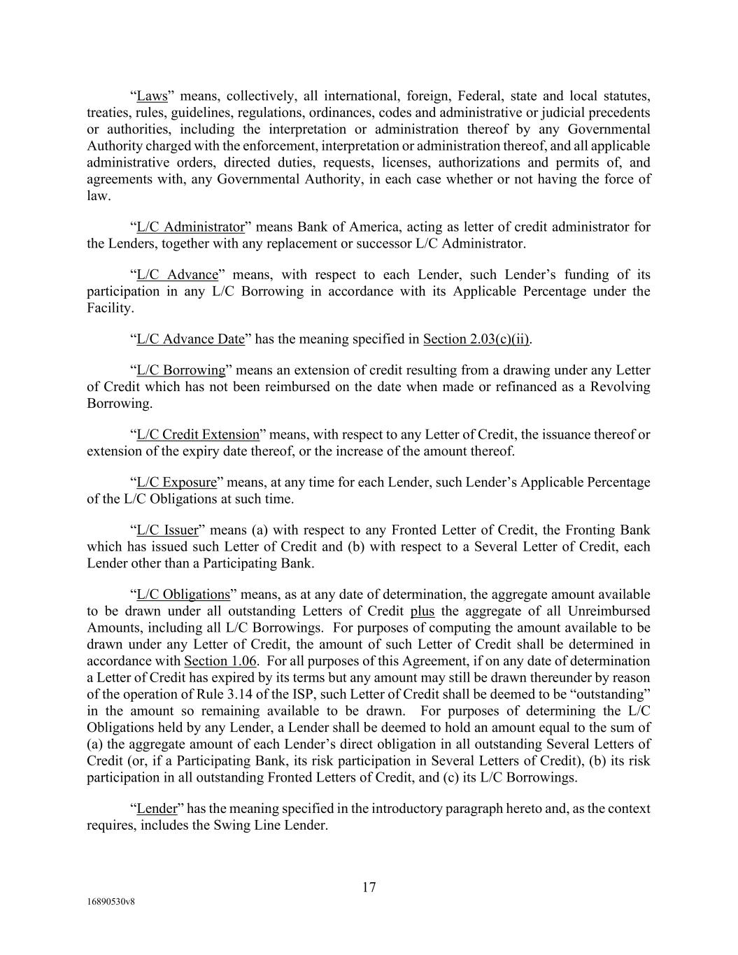 16890530v8 17 “Laws” means, collectively, all international, foreign, Federal, state and local statutes, treaties, rules, guidelines, regulations, ordinances, codes and administrative or judicial precedents or authorities, including the interpretation or administration thereof by any Governmental Authority charged with the enforcement, interpretation or administration thereof, and all applicable administrative orders, directed duties, requests, licenses, authorizations and permits of, and agreements with, any Governmental Authority, in each case whether or not having the force of law. “L/C Administrator” means Bank of America, acting as letter of credit administrator for the Lenders, together with any replacement or successor L/C Administrator. “L/C Advance” means, with respect to each Lender, such Lender’s funding of its participation in any L/C Borrowing in accordance with its Applicable Percentage under the Facility. “L/C Advance Date” has the meaning specified in Section 2.03(c)(ii). “L/C Borrowing” means an extension of credit resulting from a drawing under any Letter of Credit which has not been reimbursed on the date when made or refinanced as a Revolving Borrowing. “L/C Credit Extension” means, with respect to any Letter of Credit, the issuance thereof or extension of the expiry date thereof, or the increase of the amount thereof. “L/C Exposure” means, at any time for each Lender, such Lender’s Applicable Percentage of the L/C Obligations at such time. “L/C Issuer” means (a) with respect to any Fronted Letter of Credit, the Fronting Bank which has issued such Letter of Credit and (b) with respect to a Several Letter of Credit, each Lender other than a Participating Bank. “L/C Obligations” means, as at any date of determination, the aggregate amount available to be drawn under all outstanding Letters of Credit plus the aggregate of all Unreimbursed Amounts, including all L/C Borrowings. For purposes of computing the amount available to be drawn under any Letter of Credit, the amount of such Letter of Credit shall be determined in accordance with Section 1.06. For all purposes of this Agreement, if on any date of determination a Letter of Credit has expired by its terms but any amount may still be drawn thereunder by reason of the operation of Rule 3.14 of the ISP, such Letter of Credit shall be deemed to be “outstanding” in the amount so remaining available to be drawn. For purposes of determining the L/C Obligations held by any Lender, a Lender shall be deemed to hold an amount equal to the sum of (a) the aggregate amount of each Lender’s direct obligation in all outstanding Several Letters of Credit (or, if a Participating Bank, its risk participation in Several Letters of Credit), (b) its risk participation in all outstanding Fronted Letters of Credit, and (c) its L/C Borrowings. “Lender” has the meaning specified in the introductory paragraph hereto and, as the context requires, includes the Swing Line Lender.