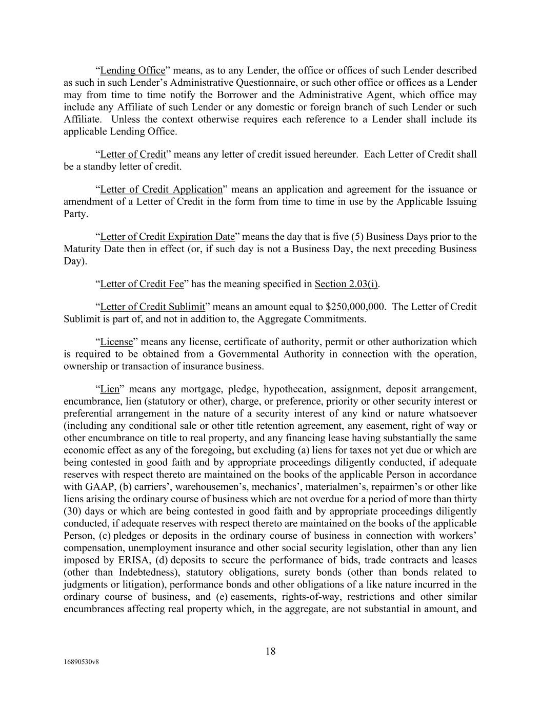 16890530v8 18 “Lending Office” means, as to any Lender, the office or offices of such Lender described as such in such Lender’s Administrative Questionnaire, or such other office or offices as a Lender may from time to time notify the Borrower and the Administrative Agent, which office may include any Affiliate of such Lender or any domestic or foreign branch of such Lender or such Affiliate. Unless the context otherwise requires each reference to a Lender shall include its applicable Lending Office. “Letter of Credit” means any letter of credit issued hereunder. Each Letter of Credit shall be a standby letter of credit. “Letter of Credit Application” means an application and agreement for the issuance or amendment of a Letter of Credit in the form from time to time in use by the Applicable Issuing Party. “Letter of Credit Expiration Date” means the day that is five (5) Business Days prior to the Maturity Date then in effect (or, if such day is not a Business Day, the next preceding Business Day). “Letter of Credit Fee” has the meaning specified in Section 2.03(i). “Letter of Credit Sublimit” means an amount equal to $250,000,000. The Letter of Credit Sublimit is part of, and not in addition to, the Aggregate Commitments. “License” means any license, certificate of authority, permit or other authorization which is required to be obtained from a Governmental Authority in connection with the operation, ownership or transaction of insurance business. “Lien” means any mortgage, pledge, hypothecation, assignment, deposit arrangement, encumbrance, lien (statutory or other), charge, or preference, priority or other security interest or preferential arrangement in the nature of a security interest of any kind or nature whatsoever (including any conditional sale or other title retention agreement, any easement, right of way or other encumbrance on title to real property, and any financing lease having substantially the same economic effect as any of the foregoing, but excluding (a) liens for taxes not yet due or which are being contested in good faith and by appropriate proceedings diligently conducted, if adequate reserves with respect thereto are maintained on the books of the applicable Person in accordance with GAAP, (b) carriers’, warehousemen’s, mechanics’, materialmen’s, repairmen’s or other like liens arising the ordinary course of business which are not overdue for a period of more than thirty (30) days or which are being contested in good faith and by appropriate proceedings diligently conducted, if adequate reserves with respect thereto are maintained on the books of the applicable Person, (c) pledges or deposits in the ordinary course of business in connection with workers’ compensation, unemployment insurance and other social security legislation, other than any lien imposed by ERISA, (d) deposits to secure the performance of bids, trade contracts and leases (other than Indebtedness), statutory obligations, surety bonds (other than bonds related to judgments or litigation), performance bonds and other obligations of a like nature incurred in the ordinary course of business, and (e) easements, rights-of-way, restrictions and other similar encumbrances affecting real property which, in the aggregate, are not substantial in amount, and