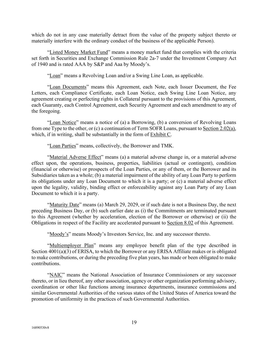 16890530v8 19 which do not in any case materially detract from the value of the property subject thereto or materially interfere with the ordinary conduct of the business of the applicable Person). “Listed Money Market Fund” means a money market fund that complies with the criteria set forth in Securities and Exchange Commission Rule 2a-7 under the Investment Company Act of 1940 and is rated AAA by S&P and Aaa by Moody’s. “Loan” means a Revolving Loan and/or a Swing Line Loan, as applicable. “Loan Documents” means this Agreement, each Note, each Issuer Document, the Fee Letters, each Compliance Certificate, each Loan Notice, each Swing Line Loan Notice, any agreement creating or perfecting rights in Collateral pursuant to the provisions of this Agreement, each Guaranty, each Control Agreement, each Security Agreement and each amendment to any of the foregoing. “Loan Notice” means a notice of (a) a Borrowing, (b) a conversion of Revolving Loans from one Type to the other, or (c) a continuation of Term SOFR Loans, pursuant to Section 2.02(a), which, if in writing, shall be substantially in the form of Exhibit C. “Loan Parties” means, collectively, the Borrower and TMK. “Material Adverse Effect” means (a) a material adverse change in, or a material adverse effect upon, the operations, business, properties, liabilities (actual or contingent), condition (financial or otherwise) or prospects of the Loan Parties, or any of them, or the Borrower and its Subsidiaries taken as a whole; (b) a material impairment of the ability of any Loan Party to perform its obligations under any Loan Document to which it is a party; or (c) a material adverse effect upon the legality, validity, binding effect or enforceability against any Loan Party of any Loan Document to which it is a party. “Maturity Date” means (a) March 29, 2029, or if such date is not a Business Day, the next preceding Business Day, or (b) such earlier date as (i) the Commitments are terminated pursuant to this Agreement (whether by acceleration, election of the Borrower or otherwise) or (ii) the Obligations in respect of the Facility are accelerated pursuant to Section 8.02 of this Agreement. “Moody’s” means Moody’s Investors Service, Inc. and any successor thereto. “Multiemployer Plan” means any employee benefit plan of the type described in Section 4001(a)(3) of ERISA, to which the Borrower or any ERISA Affiliate makes or is obligated to make contributions, or during the preceding five plan years, has made or been obligated to make contributions. “NAIC” means the National Association of Insurance Commissioners or any successor thereto, or in lieu thereof, any other association, agency or other organization performing advisory, coordination or other like functions among insurance departments, insurance commissions and similar Governmental Authorities of the various states of the United States of America toward the promotion of uniformity in the practices of such Governmental Authorities.
