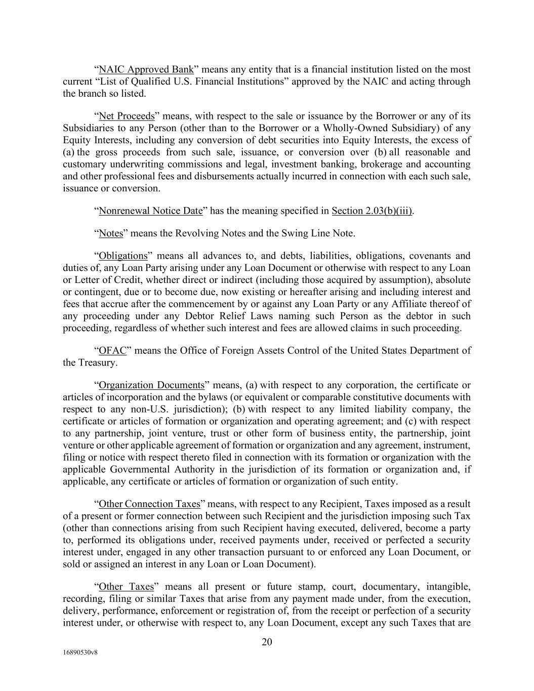 16890530v8 20 “NAIC Approved Bank” means any entity that is a financial institution listed on the most current “List of Qualified U.S. Financial Institutions” approved by the NAIC and acting through the branch so listed. “Net Proceeds” means, with respect to the sale or issuance by the Borrower or any of its Subsidiaries to any Person (other than to the Borrower or a Wholly-Owned Subsidiary) of any Equity Interests, including any conversion of debt securities into Equity Interests, the excess of (a) the gross proceeds from such sale, issuance, or conversion over (b) all reasonable and customary underwriting commissions and legal, investment banking, brokerage and accounting and other professional fees and disbursements actually incurred in connection with each such sale, issuance or conversion. “Nonrenewal Notice Date” has the meaning specified in Section 2.03(b)(iii). “Notes” means the Revolving Notes and the Swing Line Note. “Obligations” means all advances to, and debts, liabilities, obligations, covenants and duties of, any Loan Party arising under any Loan Document or otherwise with respect to any Loan or Letter of Credit, whether direct or indirect (including those acquired by assumption), absolute or contingent, due or to become due, now existing or hereafter arising and including interest and fees that accrue after the commencement by or against any Loan Party or any Affiliate thereof of any proceeding under any Debtor Relief Laws naming such Person as the debtor in such proceeding, regardless of whether such interest and fees are allowed claims in such proceeding. “OFAC” means the Office of Foreign Assets Control of the United States Department of the Treasury. “Organization Documents” means, (a) with respect to any corporation, the certificate or articles of incorporation and the bylaws (or equivalent or comparable constitutive documents with respect to any non-U.S. jurisdiction); (b) with respect to any limited liability company, the certificate or articles of formation or organization and operating agreement; and (c) with respect to any partnership, joint venture, trust or other form of business entity, the partnership, joint venture or other applicable agreement of formation or organization and any agreement, instrument, filing or notice with respect thereto filed in connection with its formation or organization with the applicable Governmental Authority in the jurisdiction of its formation or organization and, if applicable, any certificate or articles of formation or organization of such entity. “Other Connection Taxes” means, with respect to any Recipient, Taxes imposed as a result of a present or former connection between such Recipient and the jurisdiction imposing such Tax (other than connections arising from such Recipient having executed, delivered, become a party to, performed its obligations under, received payments under, received or perfected a security interest under, engaged in any other transaction pursuant to or enforced any Loan Document, or sold or assigned an interest in any Loan or Loan Document). “Other Taxes” means all present or future stamp, court, documentary, intangible, recording, filing or similar Taxes that arise from any payment made under, from the execution, delivery, performance, enforcement or registration of, from the receipt or perfection of a security interest under, or otherwise with respect to, any Loan Document, except any such Taxes that are